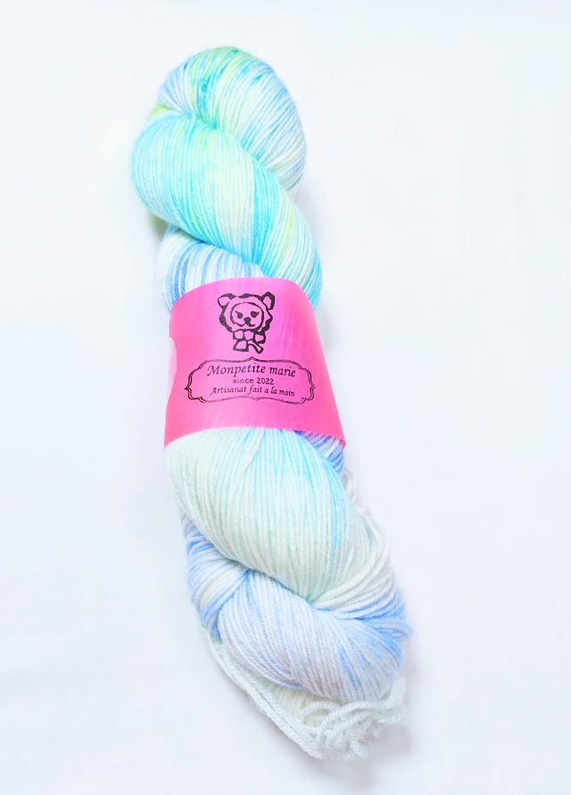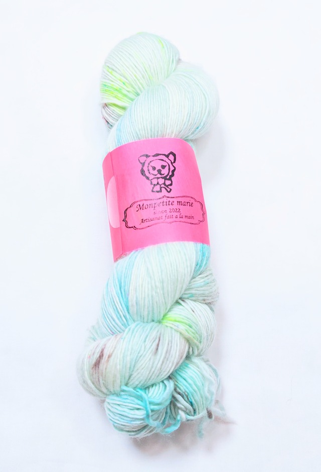 『流氷』single merino superwash superfine merino 100% singleply 約100g/400m 凍える海に浮かぶ氷の塊。浮かんでいるのは一部でその本体は海の中。見た目より体積が大きい。 太陽はあんまり出てこないけど氷の中の空気に光が反射して明るく光っているようにすら見えます。 降り積もった雪が溶けることなく圧縮されていくと深い深い青色にみえます。 日本で育って水族館や動物園にいくとついつい、アザラシや、ペンギン、クリオネがいないかと探してしまいます。 冷たく暗い冬の海でも、たくましく生命は育まれているんですよね。 グレーがかった水色にスペックルがチラリ。優しい透明感のあるニュアンスカラーに、少しだけ蛍光グリーンで華やかさをプラスしています。 中細で推奨針は2.5mmから4mm位。 本当に良いメリノウールの艶感。肌触り。 指を滑る感覚。 素晴らしい手触りメリノウールから、本当に細い繊維を選び抜いて作られた1本糸です。 柔らかく美しい光沢があり、直接肌に触れるものにとてもオススメです。意外にも毛玉になりにくく、強い糸です。防縮加工されていますので洗濯機の弱水流で洗っていただけます。必ずネットに入れて下さい。乾燥機は使えません。風通しの良い日陰に平干ししてください。 ふんわりとしたもちもちの美しい糸です。 生地糸の工程でやむ終えず結び目が入っていることがございます。 手染めの特徴で、全く同じものを染めることができません。柄や模様の出方は編む方の手加減や、使う針、編み方によって変わってきます。見本はあくまで参考です。できるだけ商品と同じ色に近づけて撮影していますが、お使いのモニターによって違う色合いに見えることがあります。 手染め毛糸の性質上、特に濃い色合いのものは染料を多く含んでいますので、色落ち、色移りがございます。他のものとは分けてお洗濯をお願いいたします。 ネットに入れて洗濯機でも洗っていただけますが、基本的に編まれた作品はウール用洗剤で30℃以下の水で静かに手洗いし、タオル等で巻いて手押しして脱水、日陰に平干ししてください。 宅急便の送料は、送料についてのお知らせショッピングガイドを参照下さい。