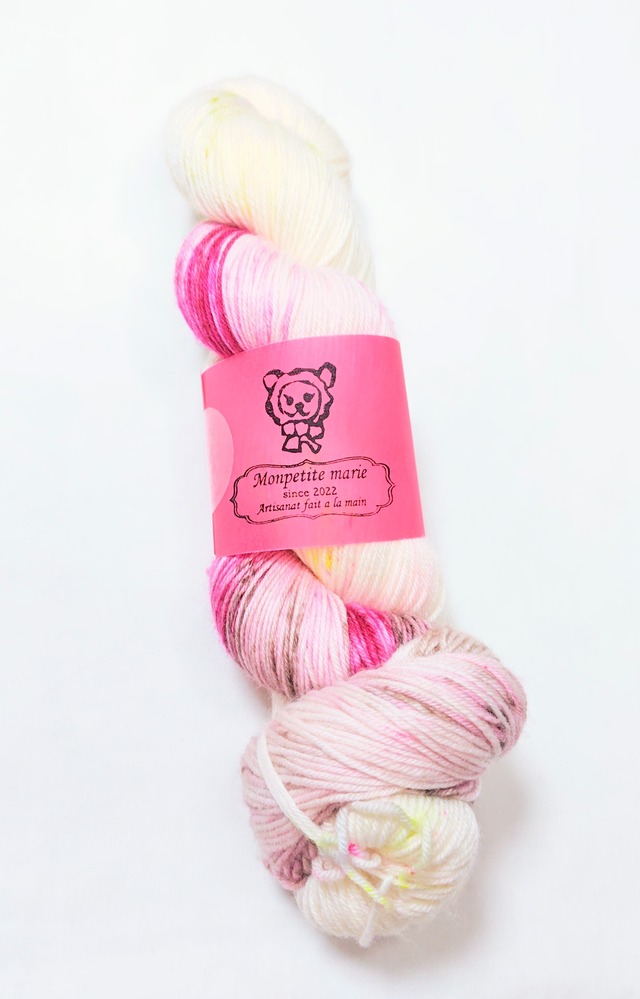『いちごのババロア』single merino superwash superfine merino 100% singleply fingerling weight 約100g/400m プリンやムースとはちょっと違う、ババロア。 ぷるぷるだけどふわっとしていて不思議な食感。 フランス生まれの冷たいデザート。 似てるけどイタリアのパンナコッタとも少し違うんです。パンナコッタよりはさっぱりしていてスッとなくなる感じ。ババロアはバイエルンの、という意味だそう。 バイエルンはドイツの南部地方だから、フランスで作られたバイエルン風のデザートということなのかな。 世界には美味しいものがいっぱいあるので、私まだまだダイエットなんてしてられません。 優しいいちごミルクカラーに蛍光赤のスペックルが新鮮。カスタードの卵色リボンをまとわせてお皿に盛り付けたらふわふわのデザートができあがり。 さあ召し上がれ! 中細で推奨針は2.5mmから4mm位。 本当に良いメリノウールの艶感。肌触り。 指を滑る感覚。 素晴らしい手触りメリノウールから、本当に細い繊維を選び抜いて作られた1本糸です。 柔らかく美しい光沢があり、直接肌に触れるものにとてもオススメです。意外にも毛玉になりにくく、強い糸です。防縮加工されていますので洗濯機の弱水流で洗っていただけます。必ずネットに入れて下さい。乾燥機は使えません。風通しの良い日陰に平干ししてください。 ふんわりとしたもちもちの美しい糸です。 生地糸の工程でやむ終えず結び目が入っていることがございます。 手染めの特徴で、全く同じものを染めることができません。柄や模様の出方は編む方の手加減や、使う針、編み方によって変わってきます。見本はあくまで参考です。できるだけ商品と同じ色に近づけて撮影していますが、お使いのモニターによって違う色合いに見えることがあります。 手染め毛糸の性質上、特に濃い色合いのものは染料を多く含んでいますので、色落ち、色移りがございます。他のものとは分けてお洗濯をお願いいたします。 ネットに入れて洗濯機でも洗っていただけますが、基本的に編まれた作品はウール用洗剤で30℃以下の水で静かに手洗いし、タオル等で巻いて手押しして脱水、日陰に平干ししてください。 宅急便の送料は、送料についてのお知らせショッピングガイドを参照下さい。