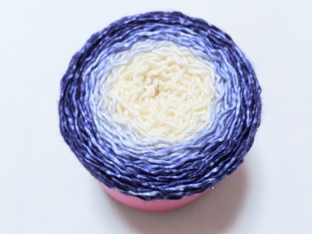 single worsted 『夜霧 C』 super wash fine merino 100% worsted weight 約100g/200m お試しで染めた並太から極太の間のゲージが出る手染め毛糸です。まず、先に平編みしてから染色しています。グラデーションになるように染めていますが、3パターンあり、コチラはCパターン。白色の割合が大きいものです。 染めた後、ゆのしをしてから巻いてあります。 柔らかくて太いふわふわのメリノウール100%で、自然なボリュームがあります。よりがないのでゆっくり引っ張らないように気をつけてください。 濃い色目ですので色移行等にお気をつけ下さい。