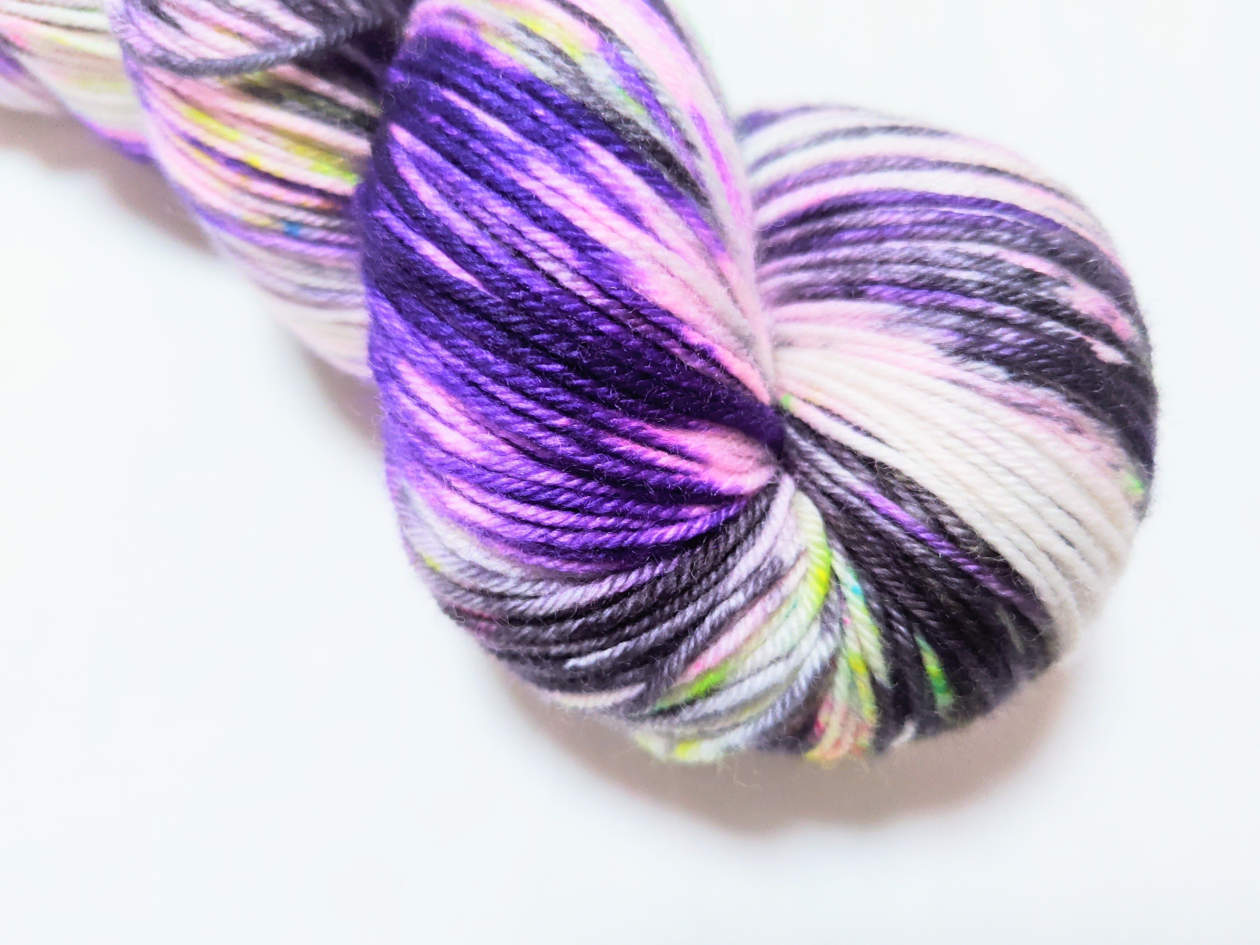 紫色と黒色のマーブルに、蛍光色のスペックルが可愛い、個性的な手染め毛糸です。