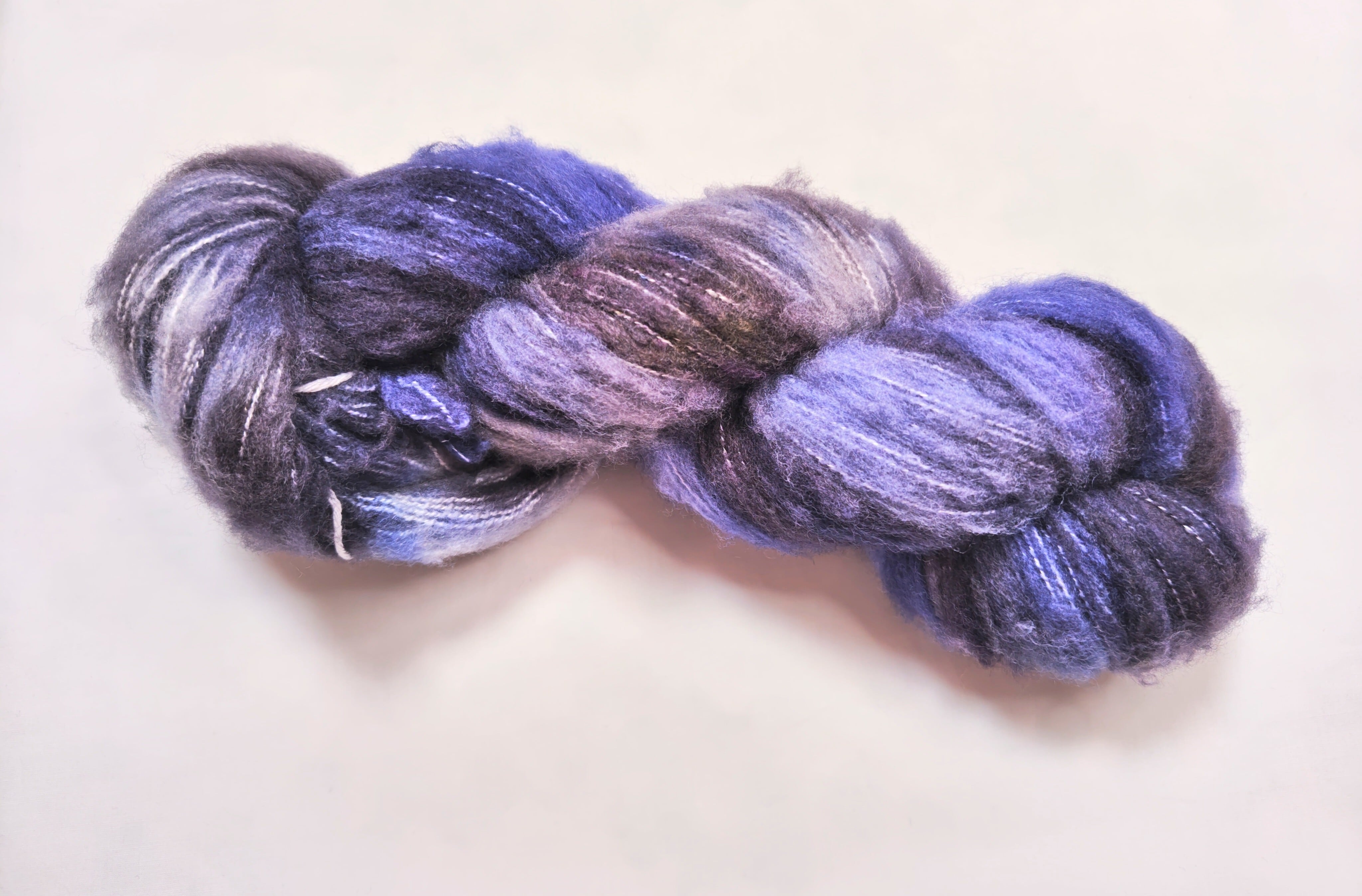 ふわふわのウールスライバーが、バンブーの芯に巻き付いている感じのふわふわフラッフィーヤーンです。モヘヤではないのですが毛足があってチクチクしません。