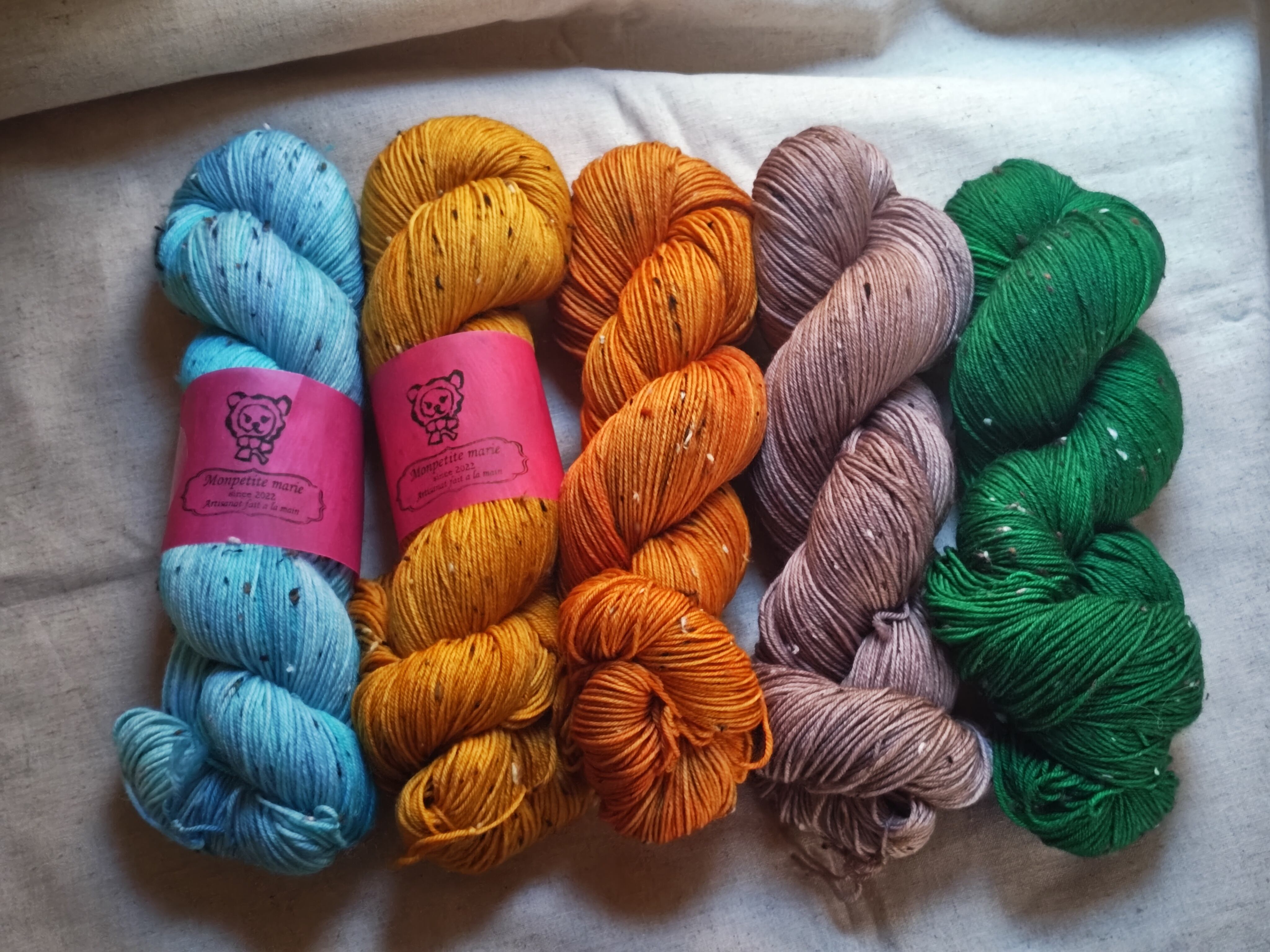 手染め毛糸の性質上、特に濃い色合いのものは染料を多く含んでいますので、色落ち、色移りがございます。他のものとは分けてお洗濯をお願いいたします。