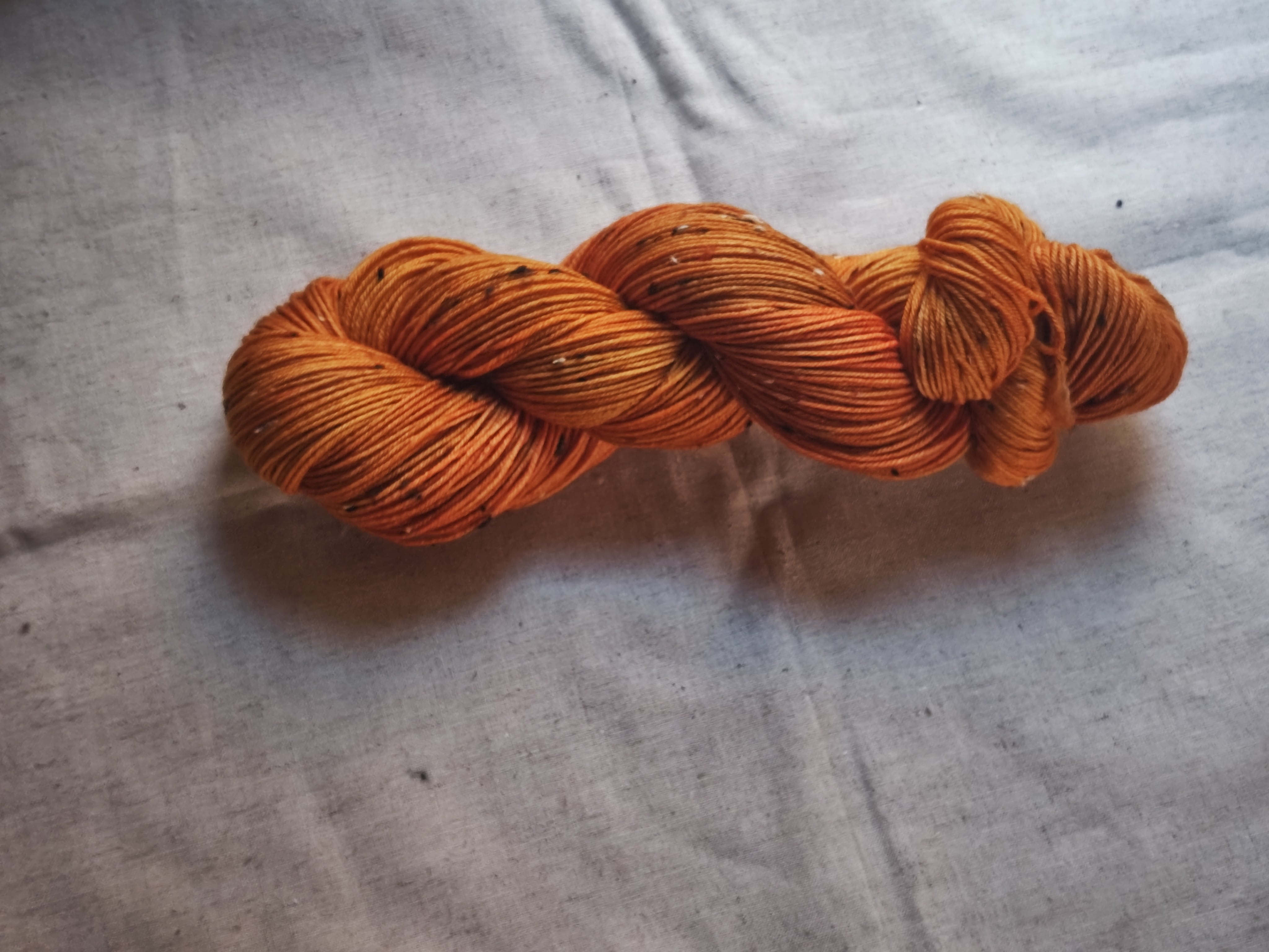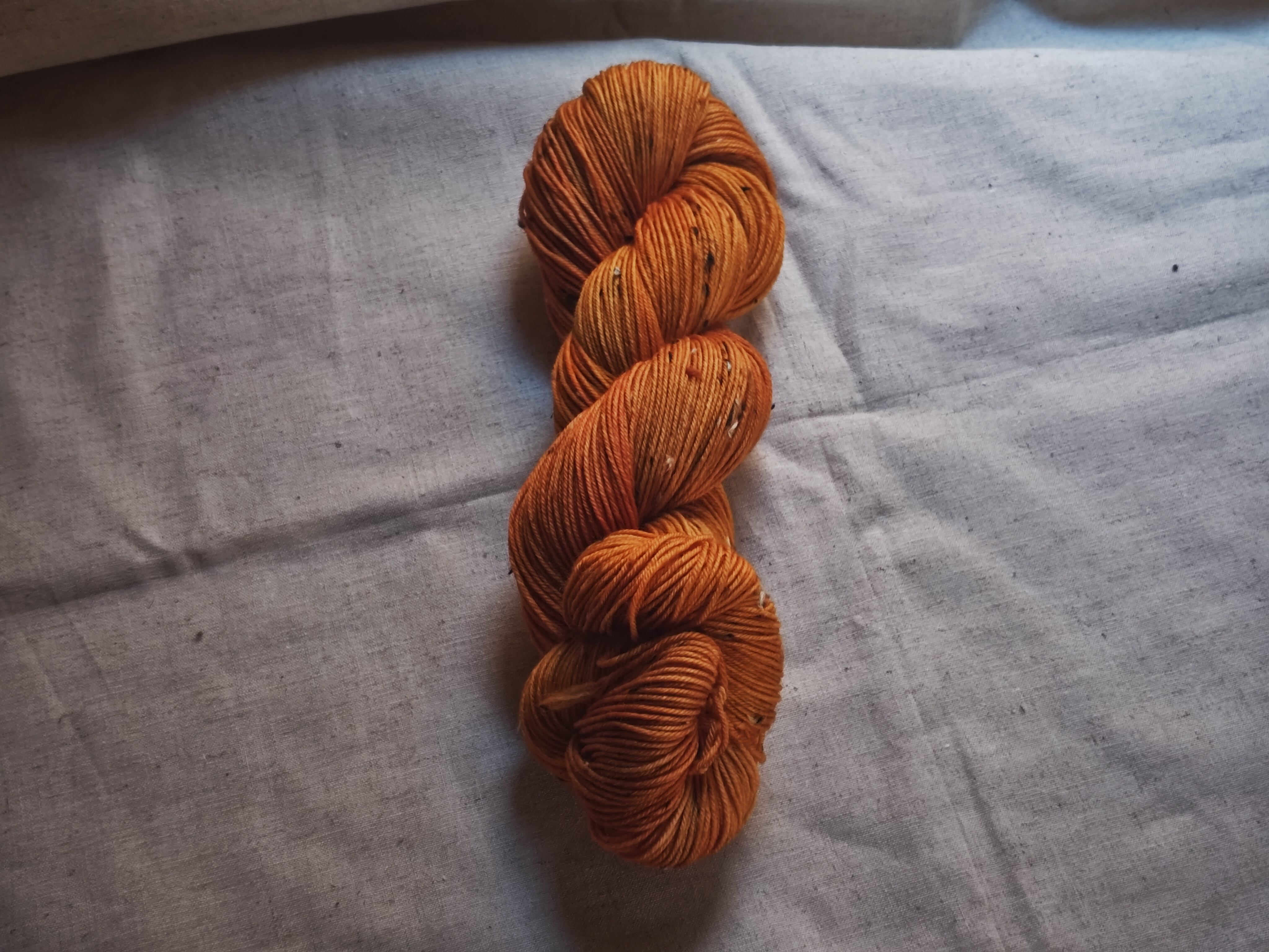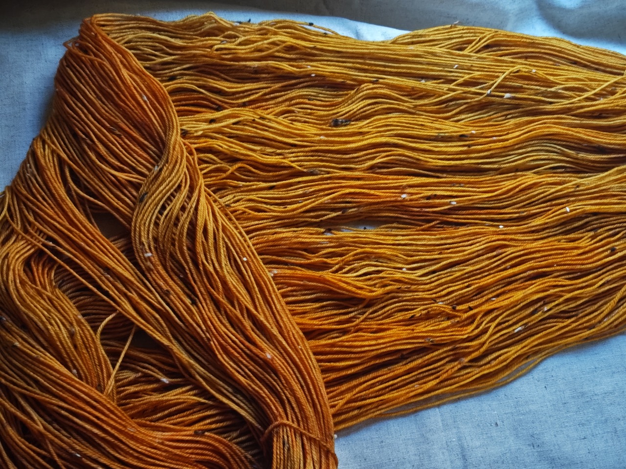 以前染めたソックヤーンの新バージョン。ベース糸をツイードに変えて。暖かそうなオレンジ色を目指しました。