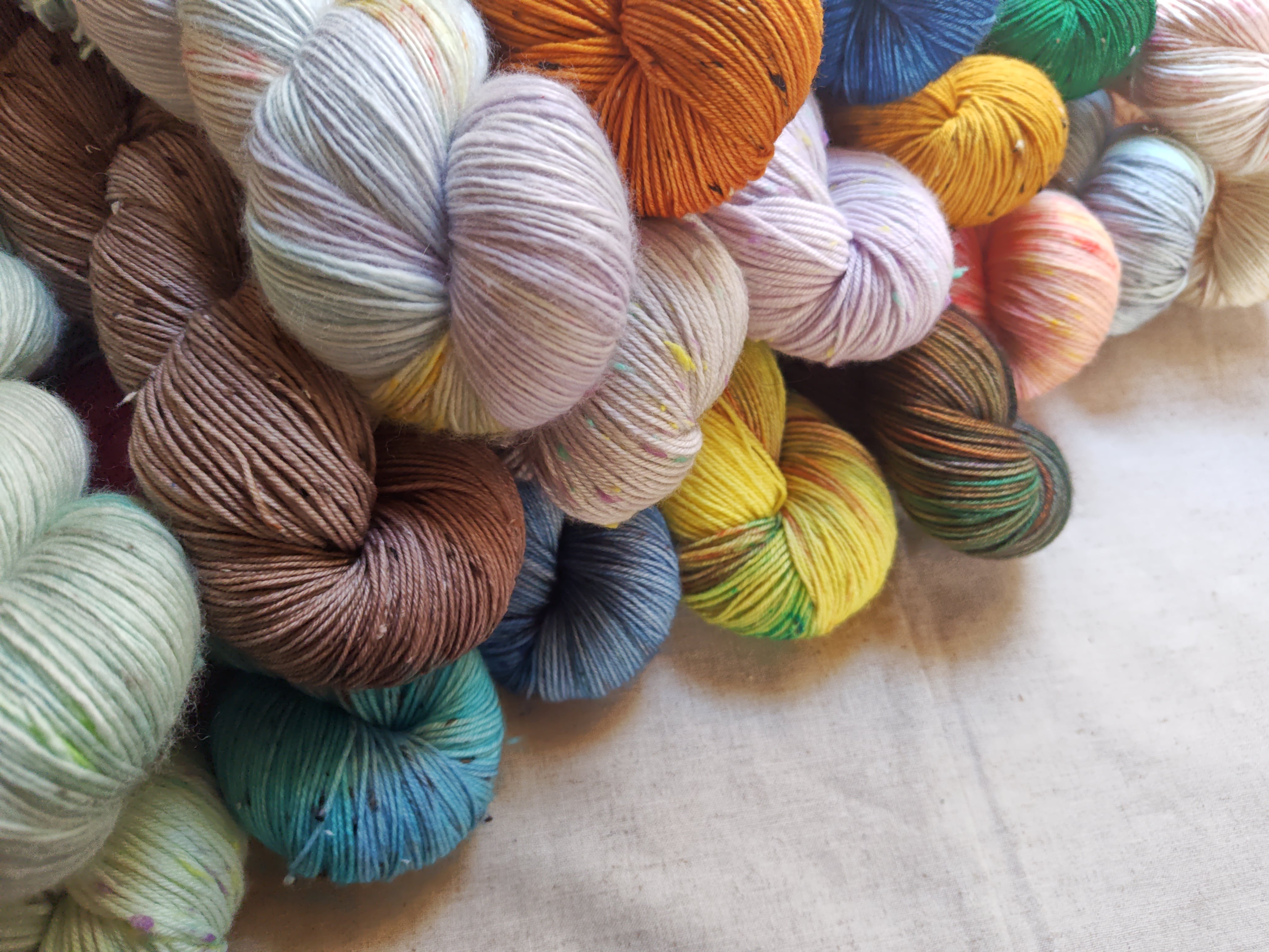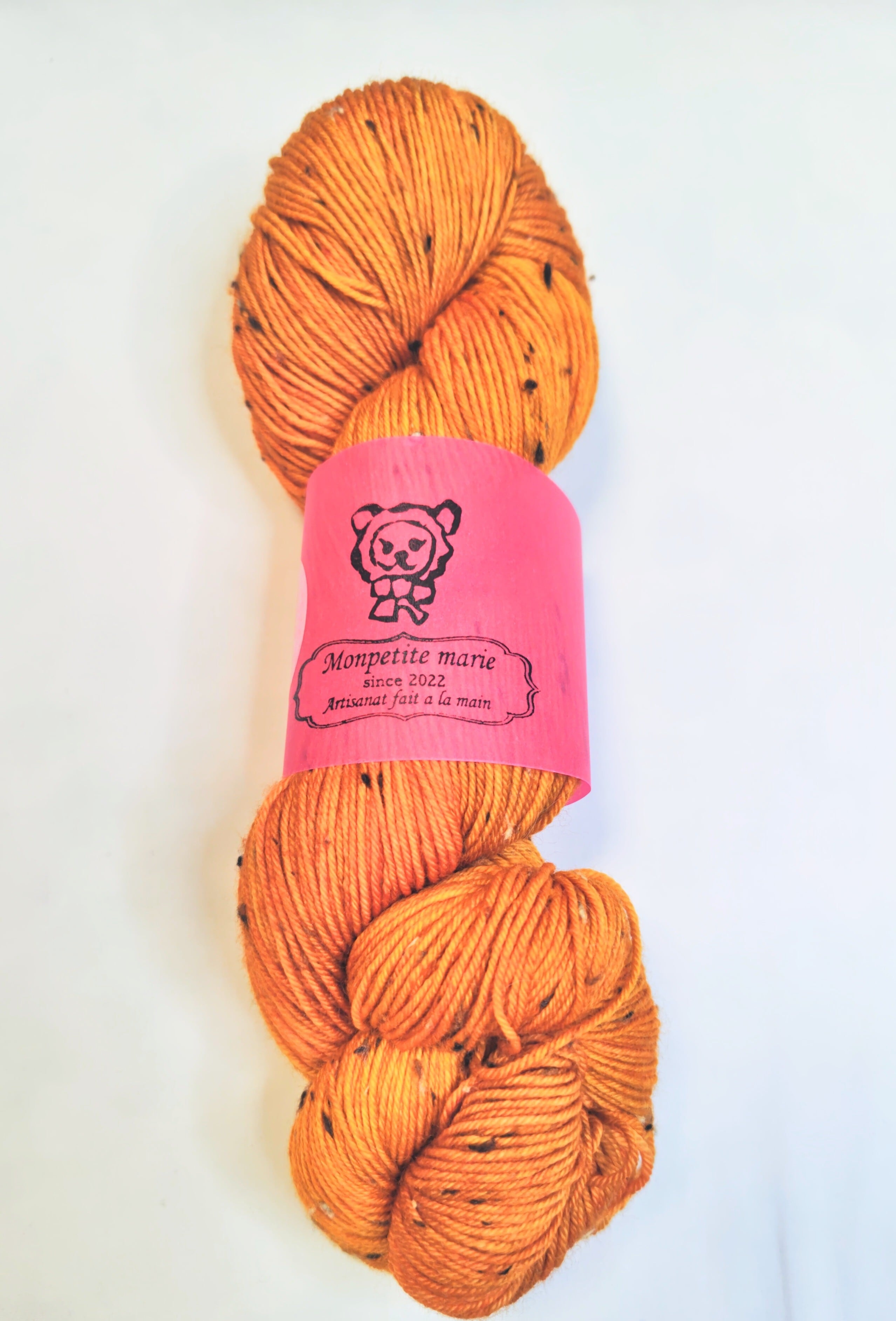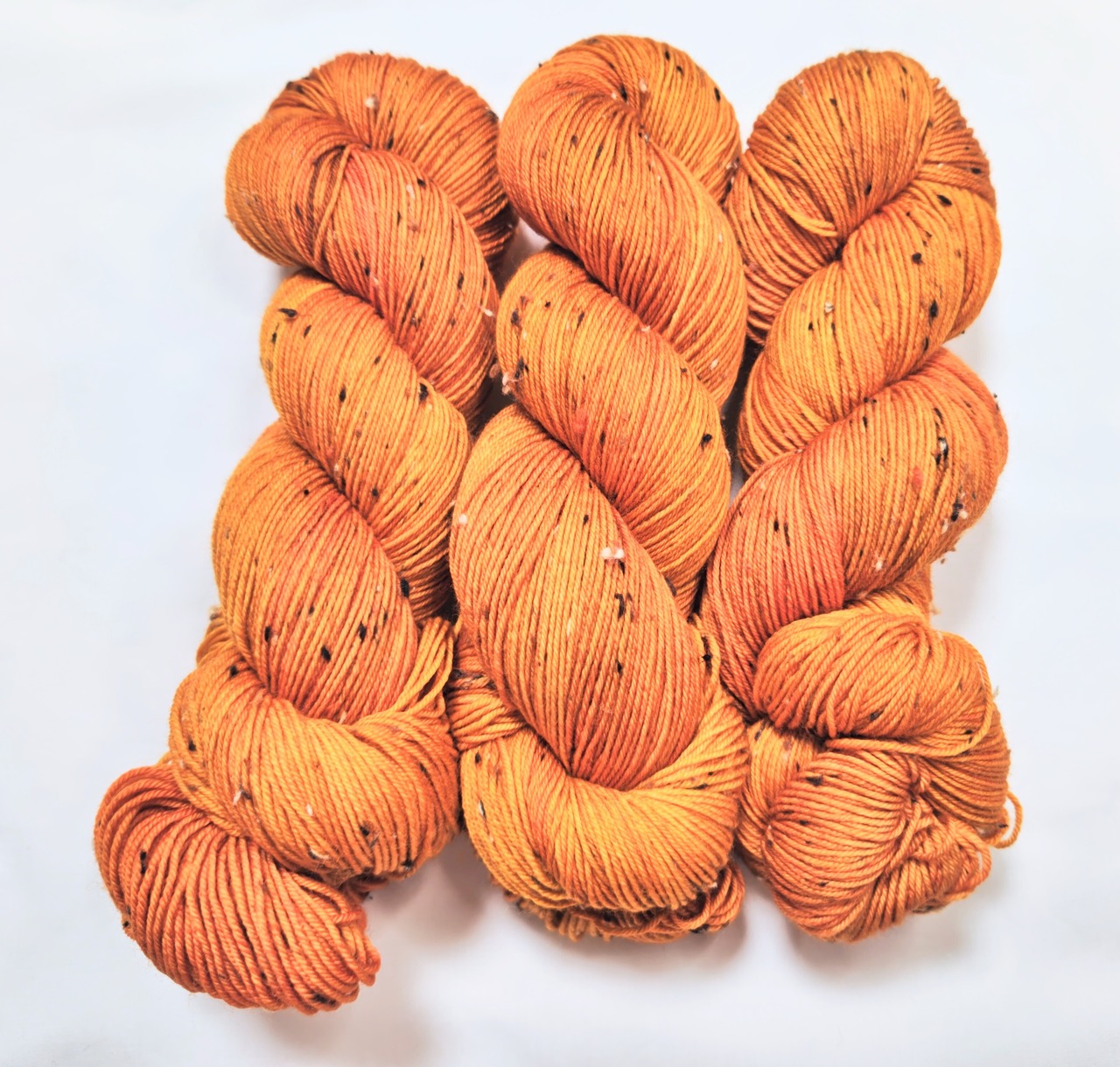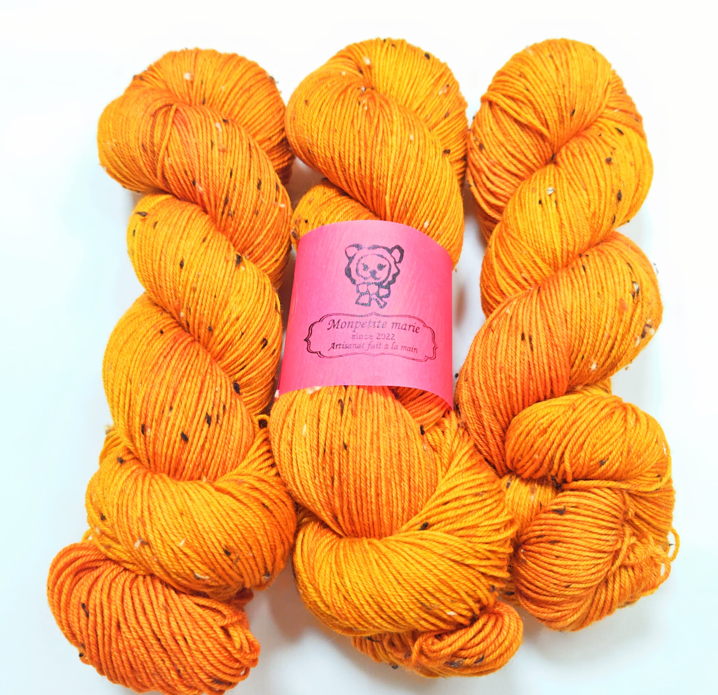 以前染めたソックヤーンの新バージョン。ベース糸をツイードに変えて。暖かそうなオレンジ色を目指しました。