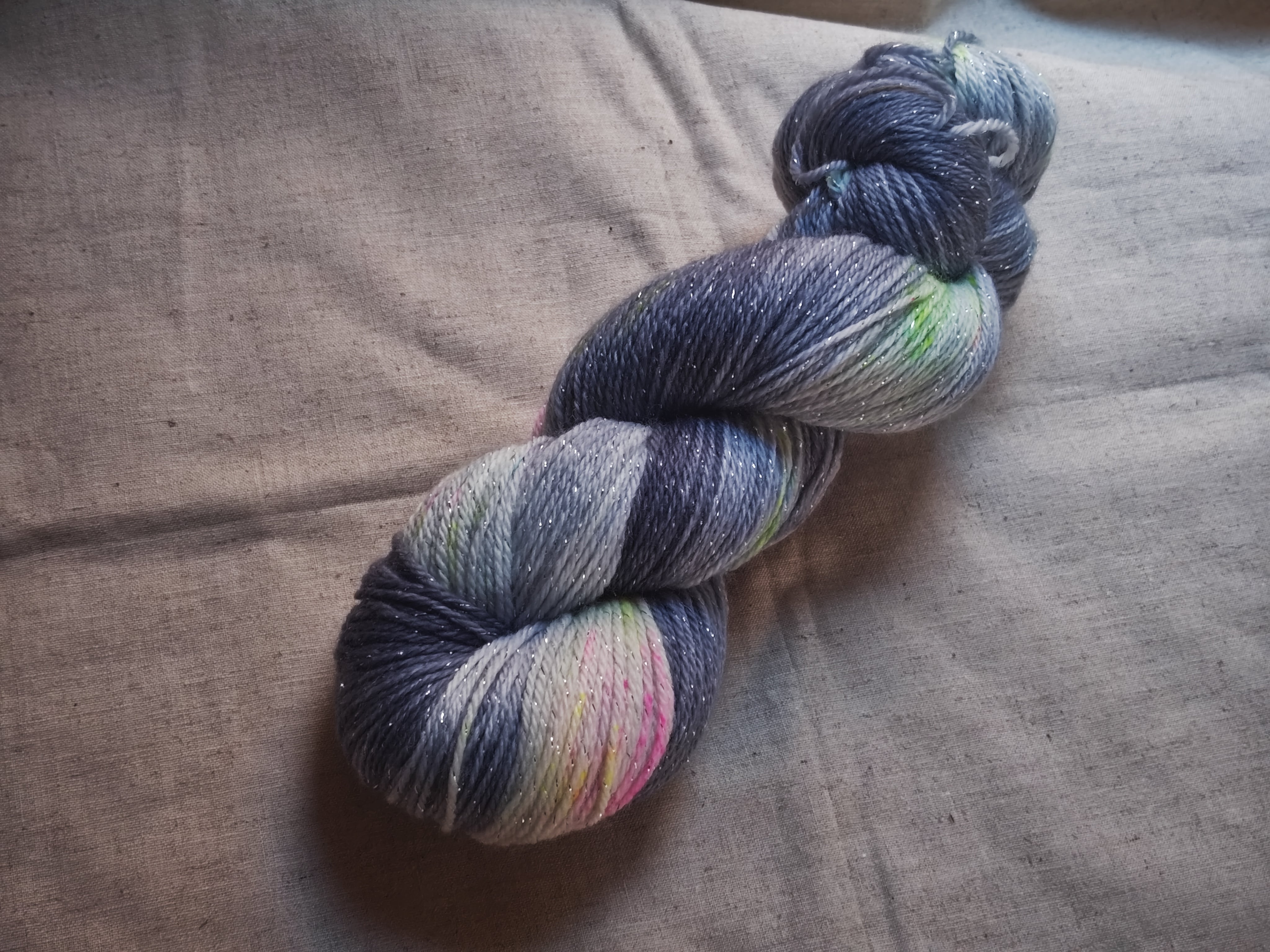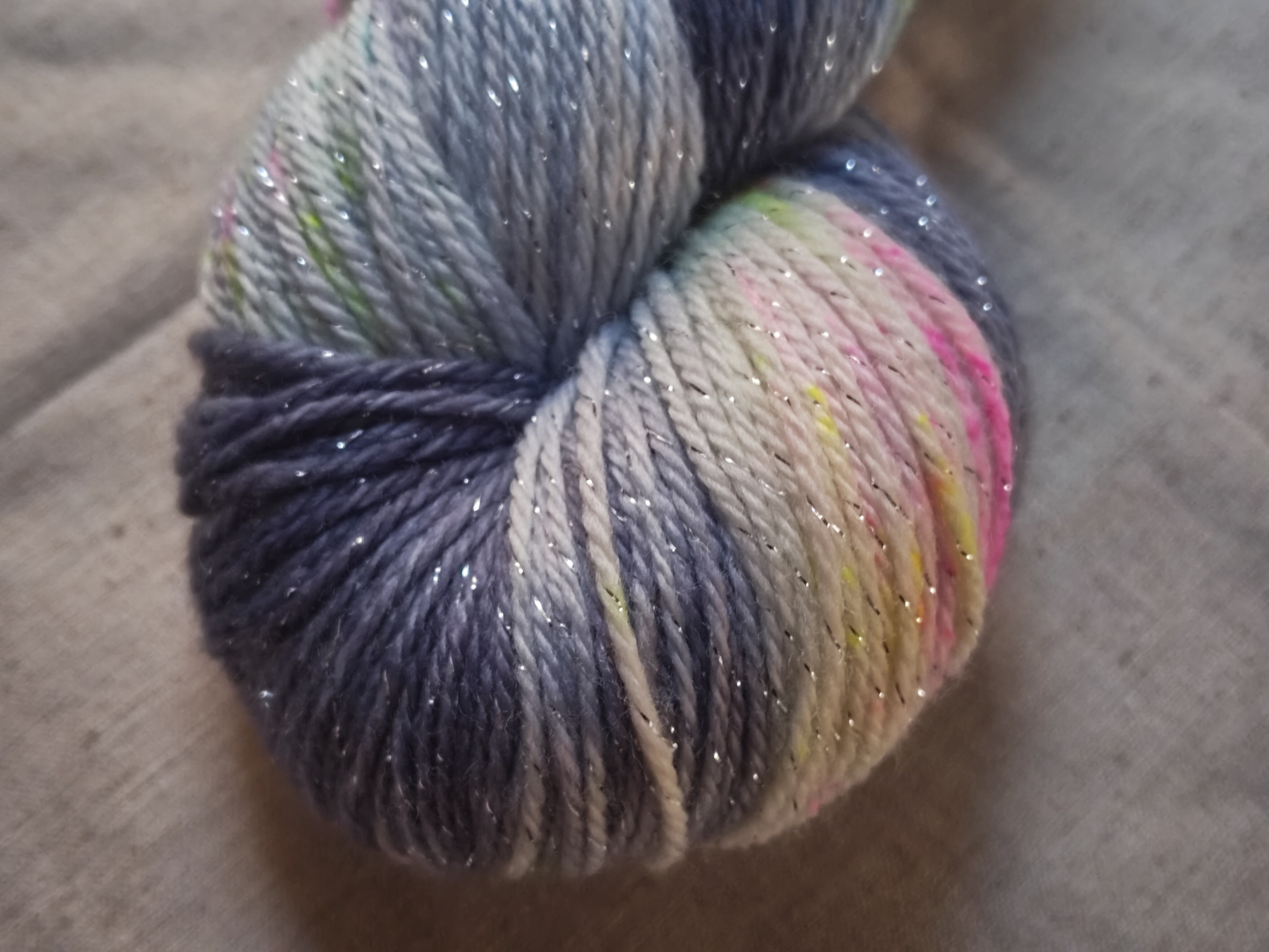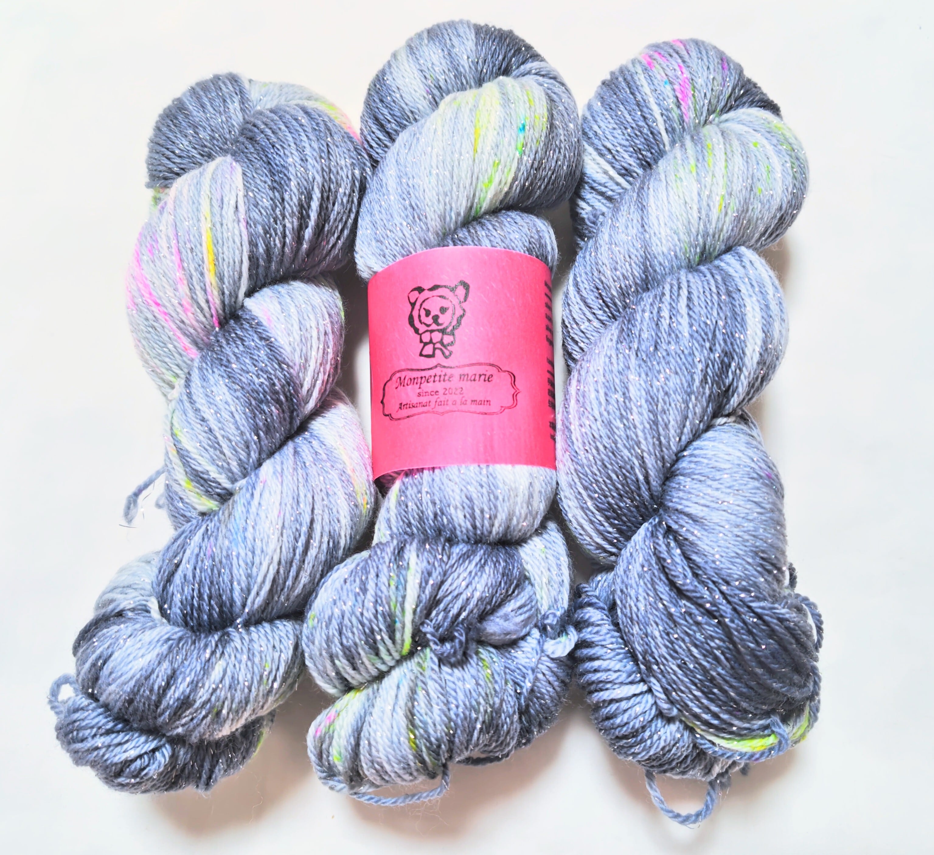スーパーウォッシュのエクストラファインメリノがふわふわで気持ちのいいソックヤーンです。3本のソックメリノとシルバールレックスのフィラメント1本をより合わせて4plyになっています。