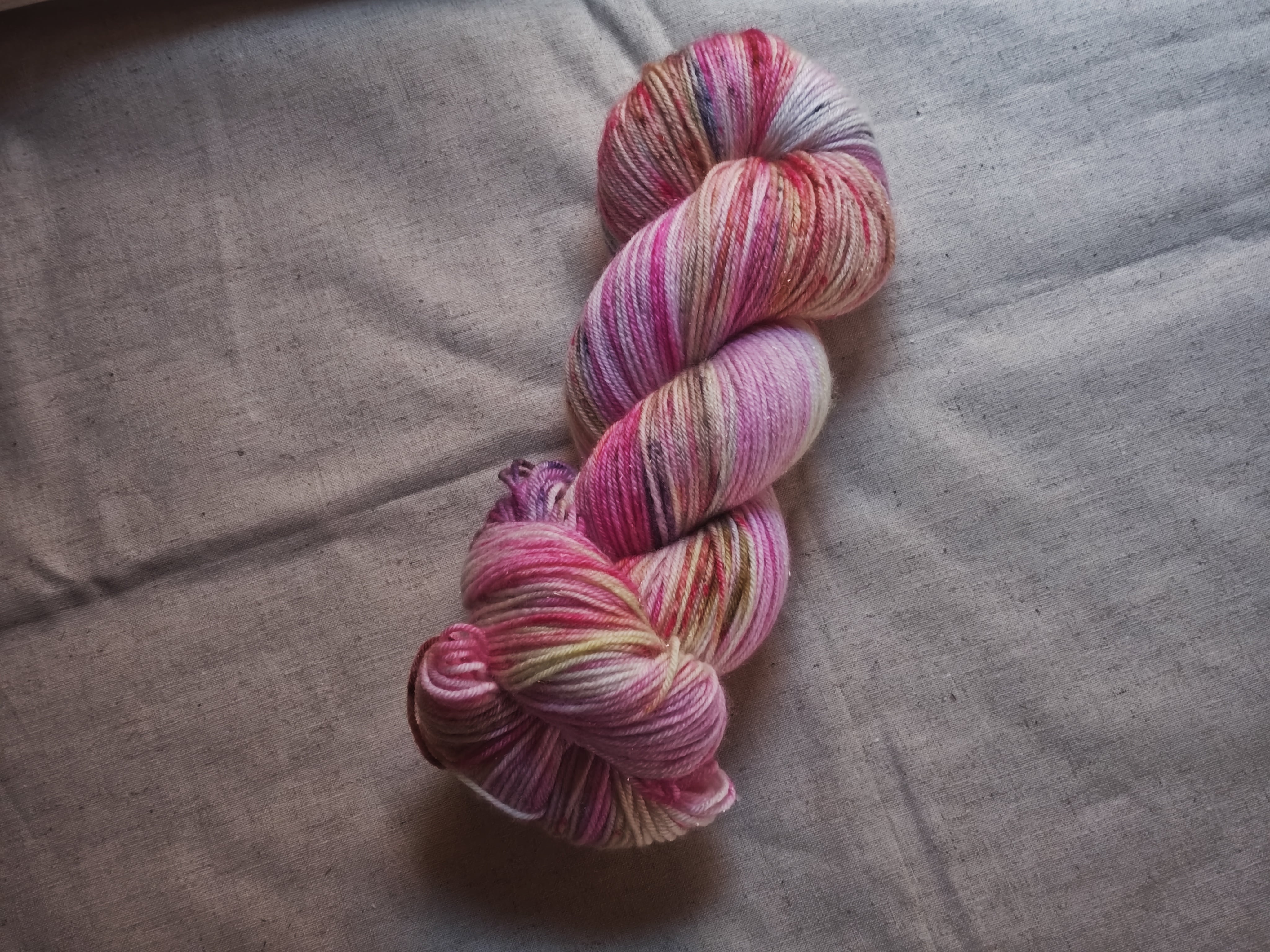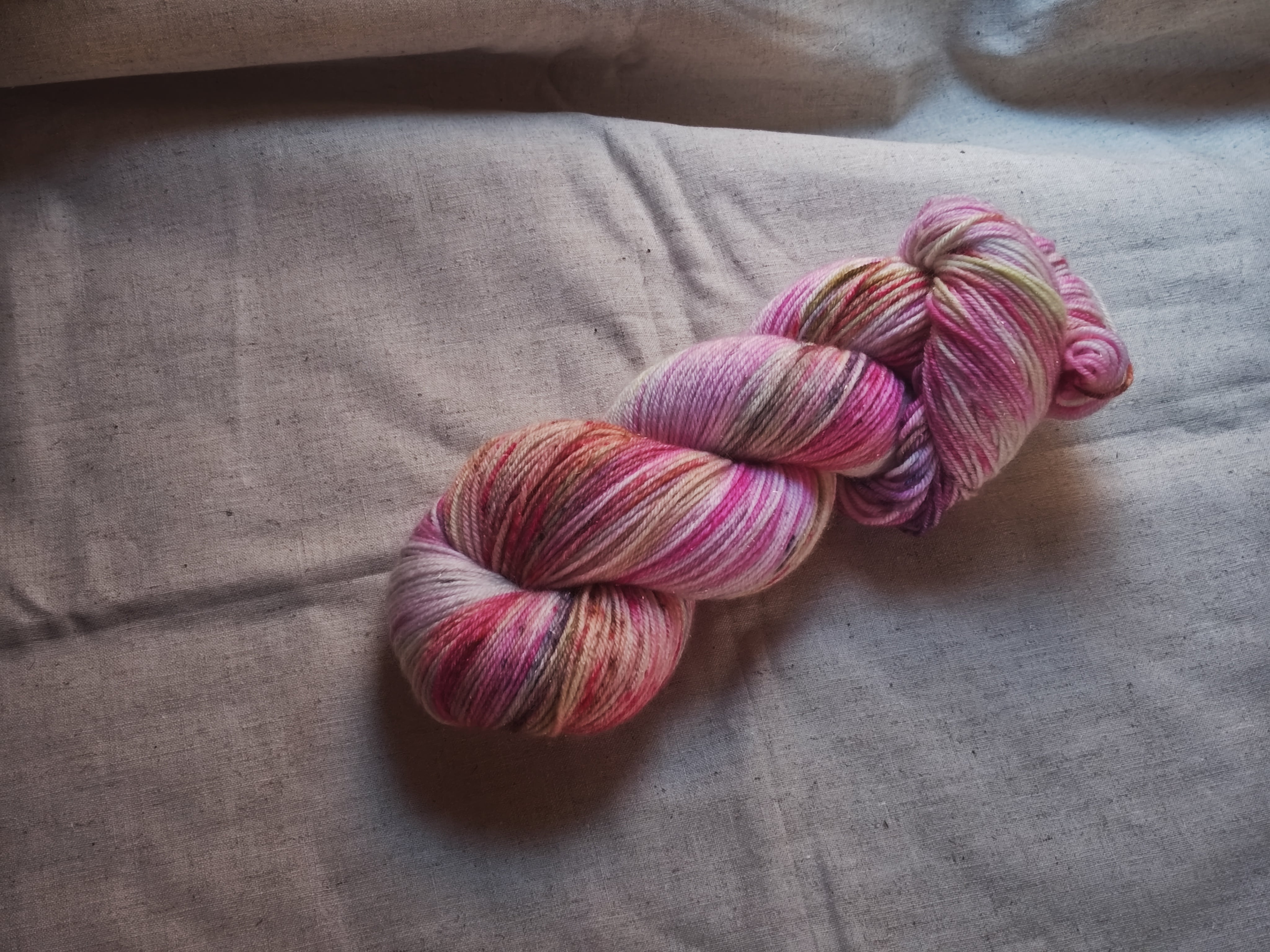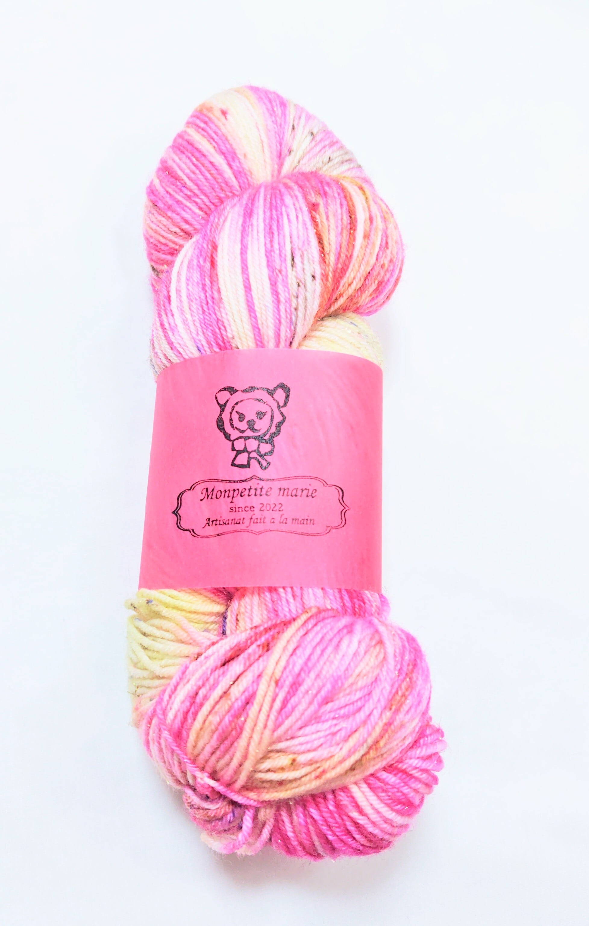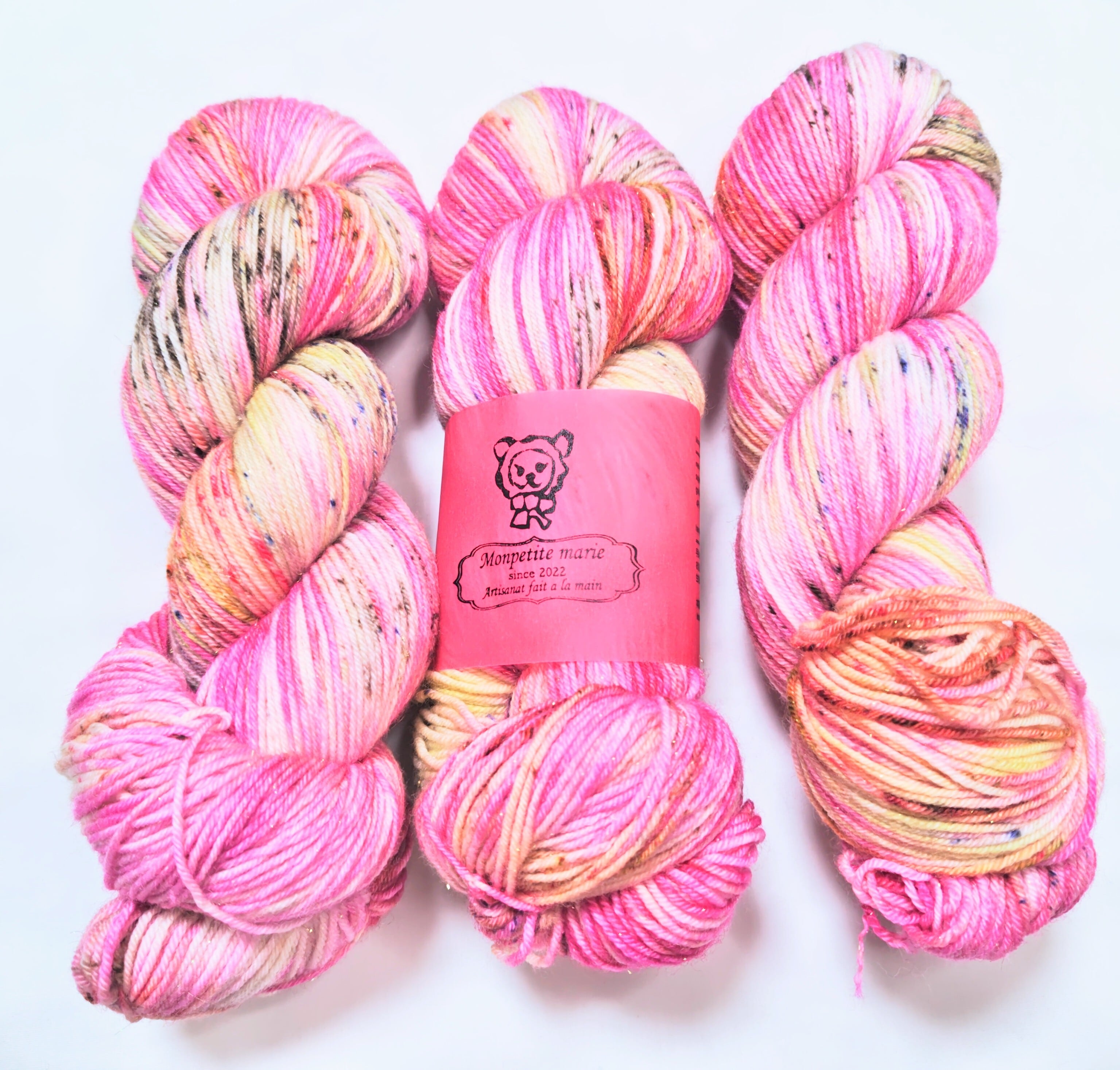 キラキラの金色のステリーナが入った手染め毛糸です。明るいピンクにスペックルが沢山。