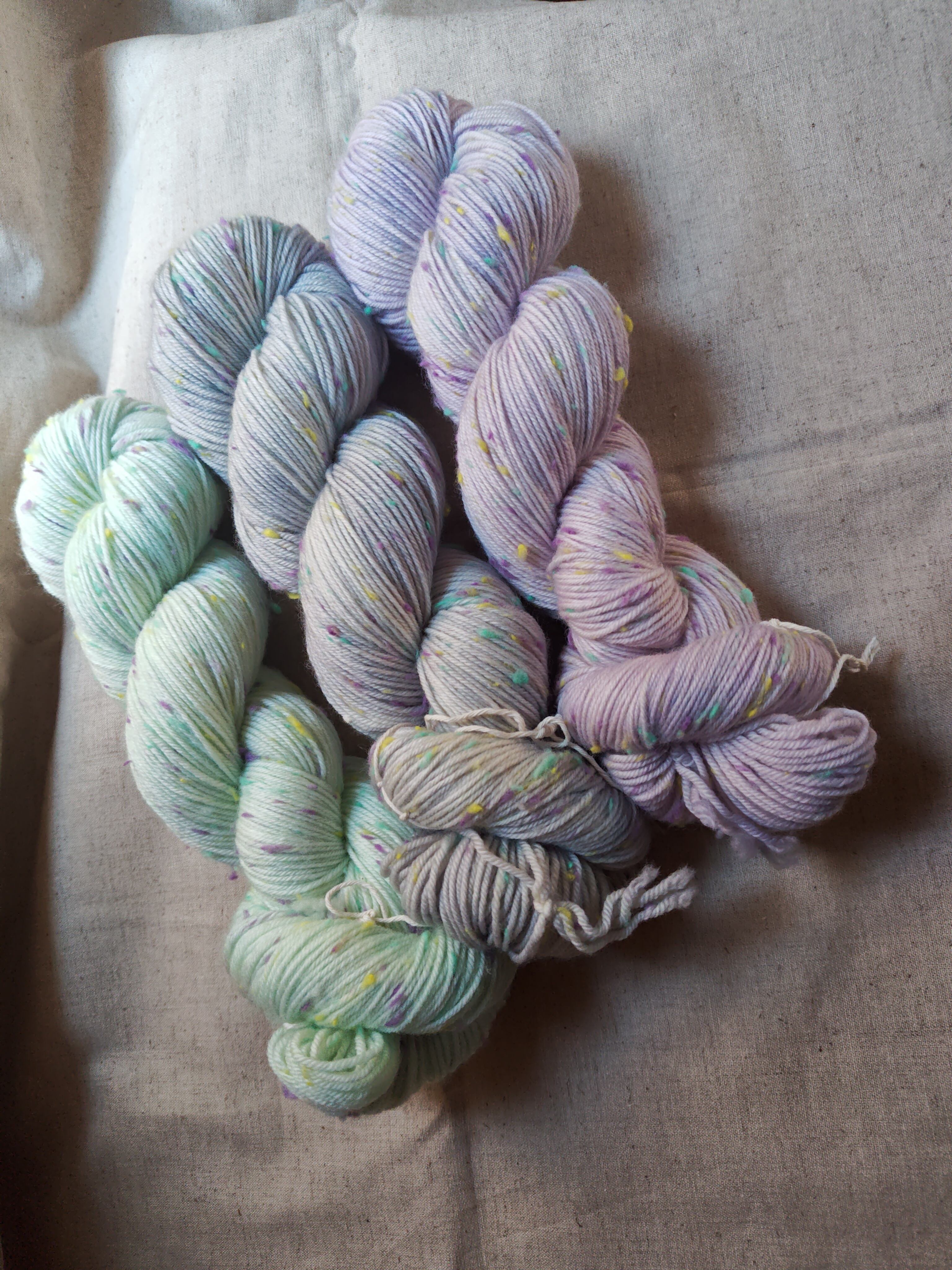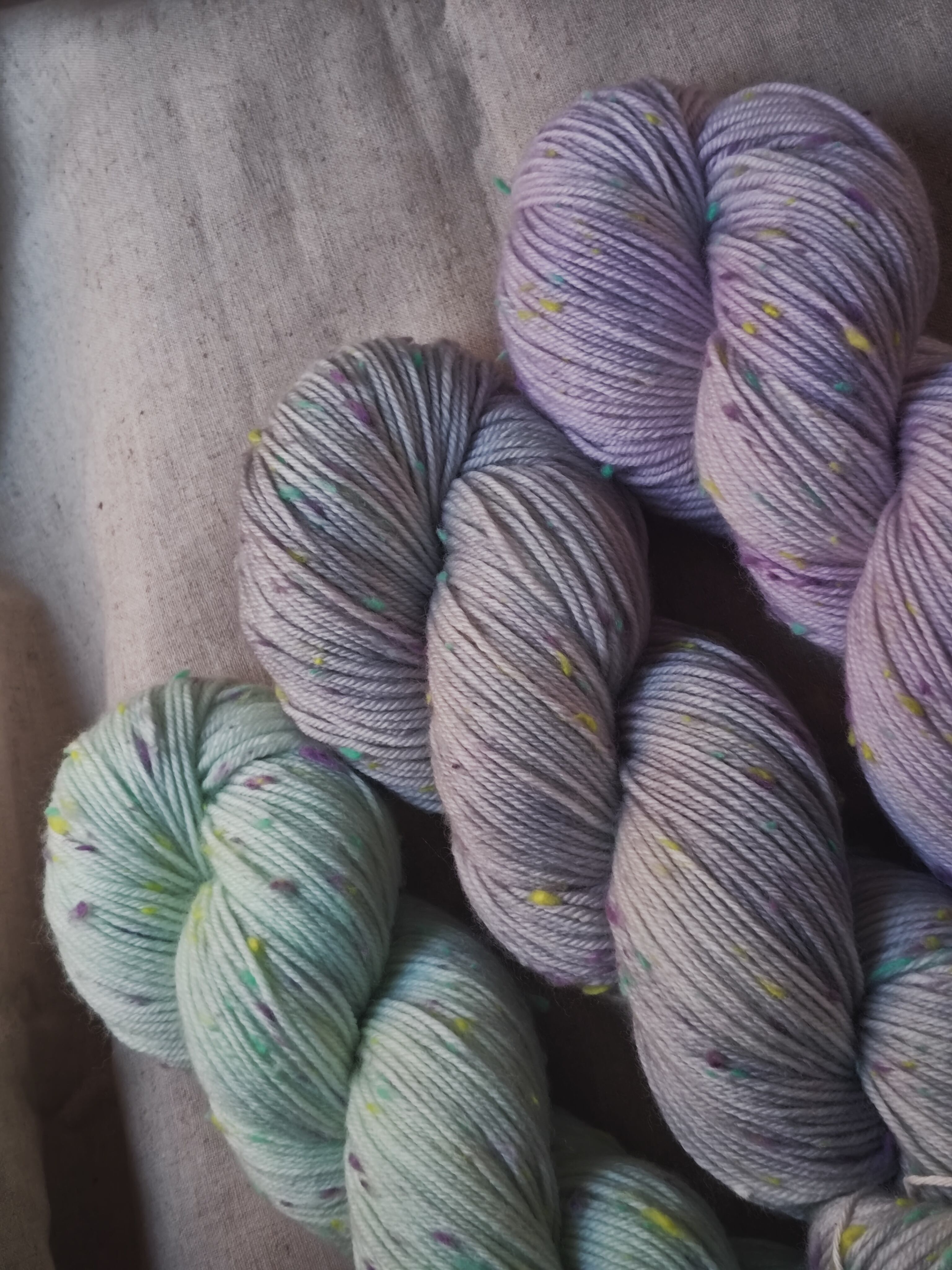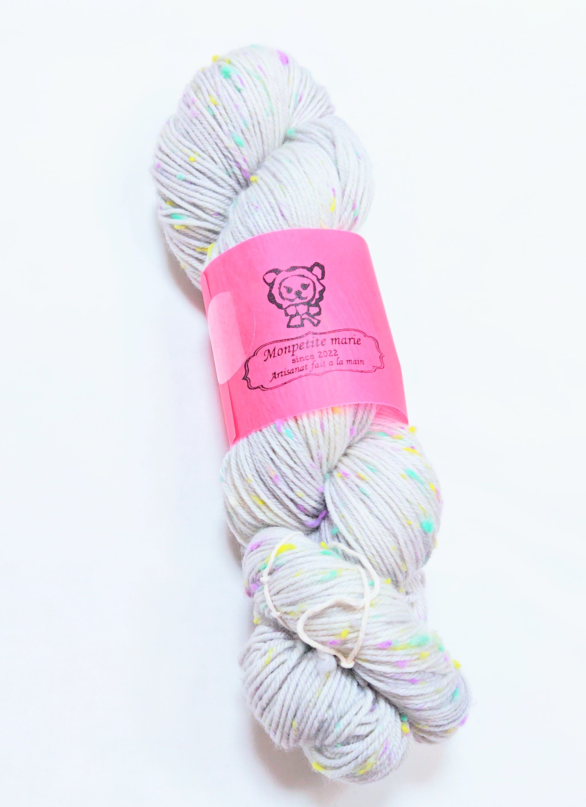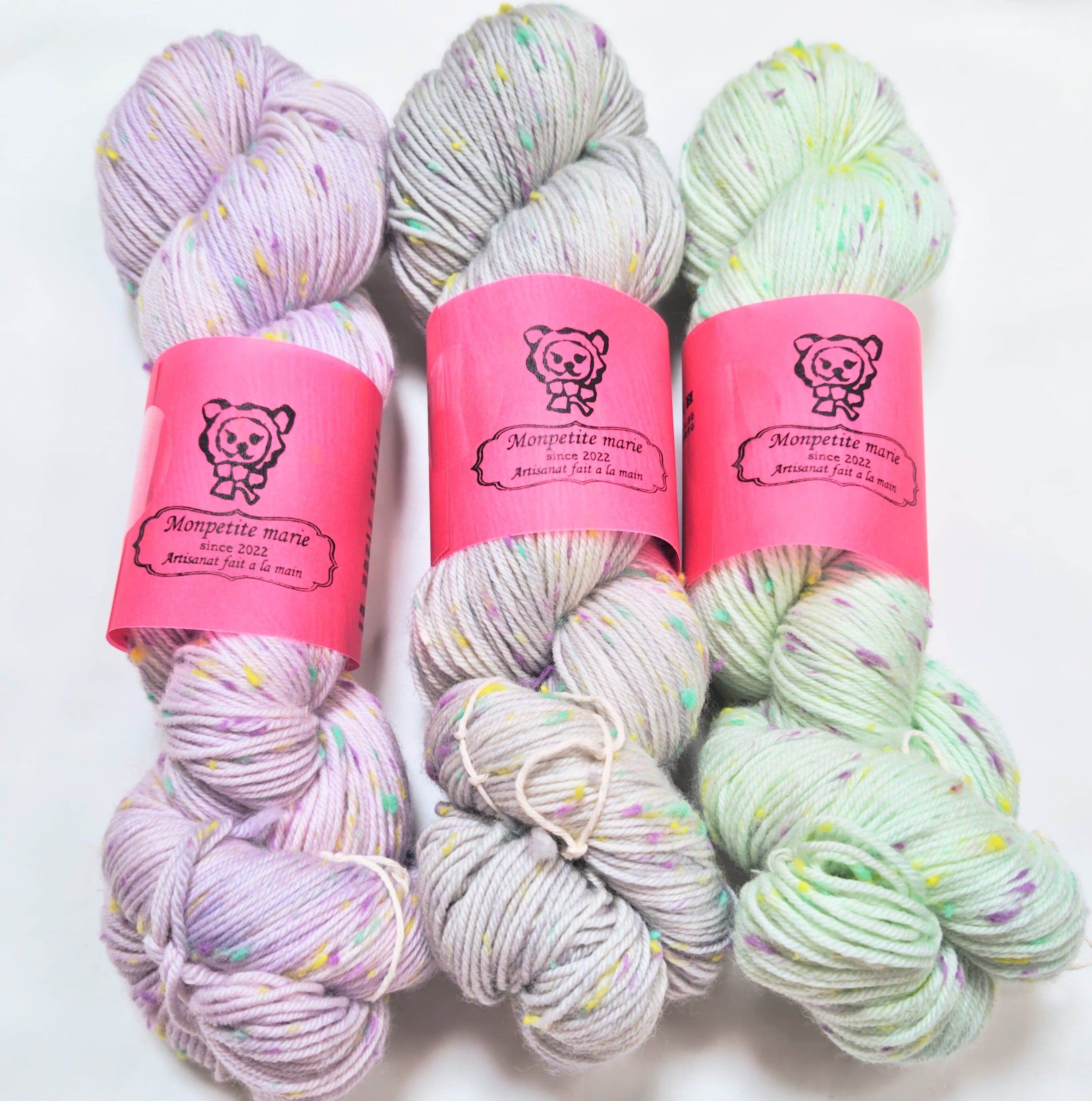 ミント、グレープ、レモンのカラフルなネップがかわいらしい糸です。やわらかな4plyのメリノウールにネップがはいることで面白い編み地になります。手染めの色とネップのカラーから生まれる創造性豊かなコンビネーションを楽しんでいただけたら嬉しいです。