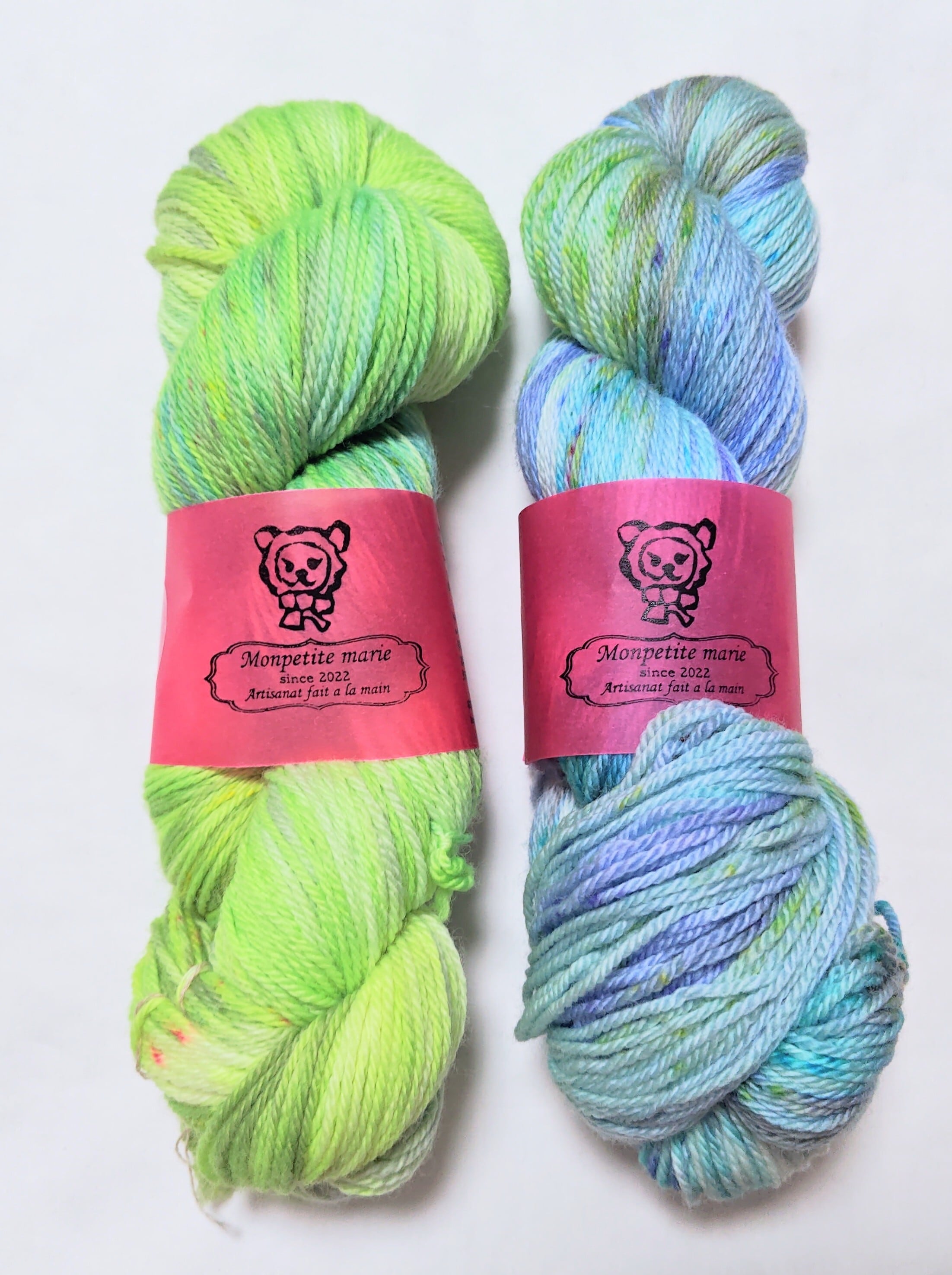 手染め毛糸の性質上、特に濃い色合いのものは染料を多く含んでいますので、色落ち、色移りがございます。