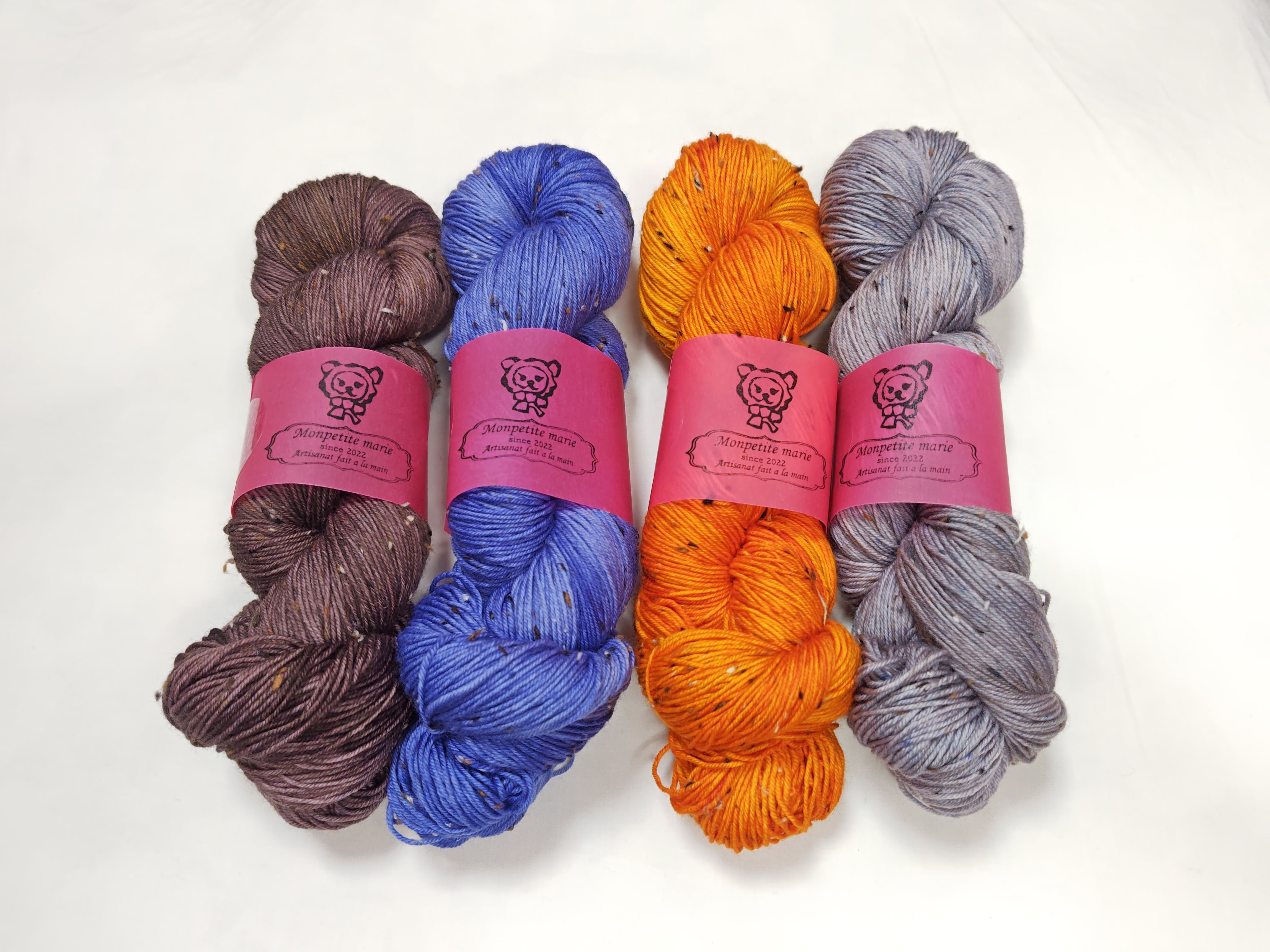 手染めの特徴で、全く同じものを染めることができません。柄や模様の出方は編む方の手加減や、使う針、編み方によって変わってきます。見本はあくまで参考です。できるだけ商品と同じ色に近づけて撮影していますが、お使いのモニターによって違う色合いに見えることがあります。