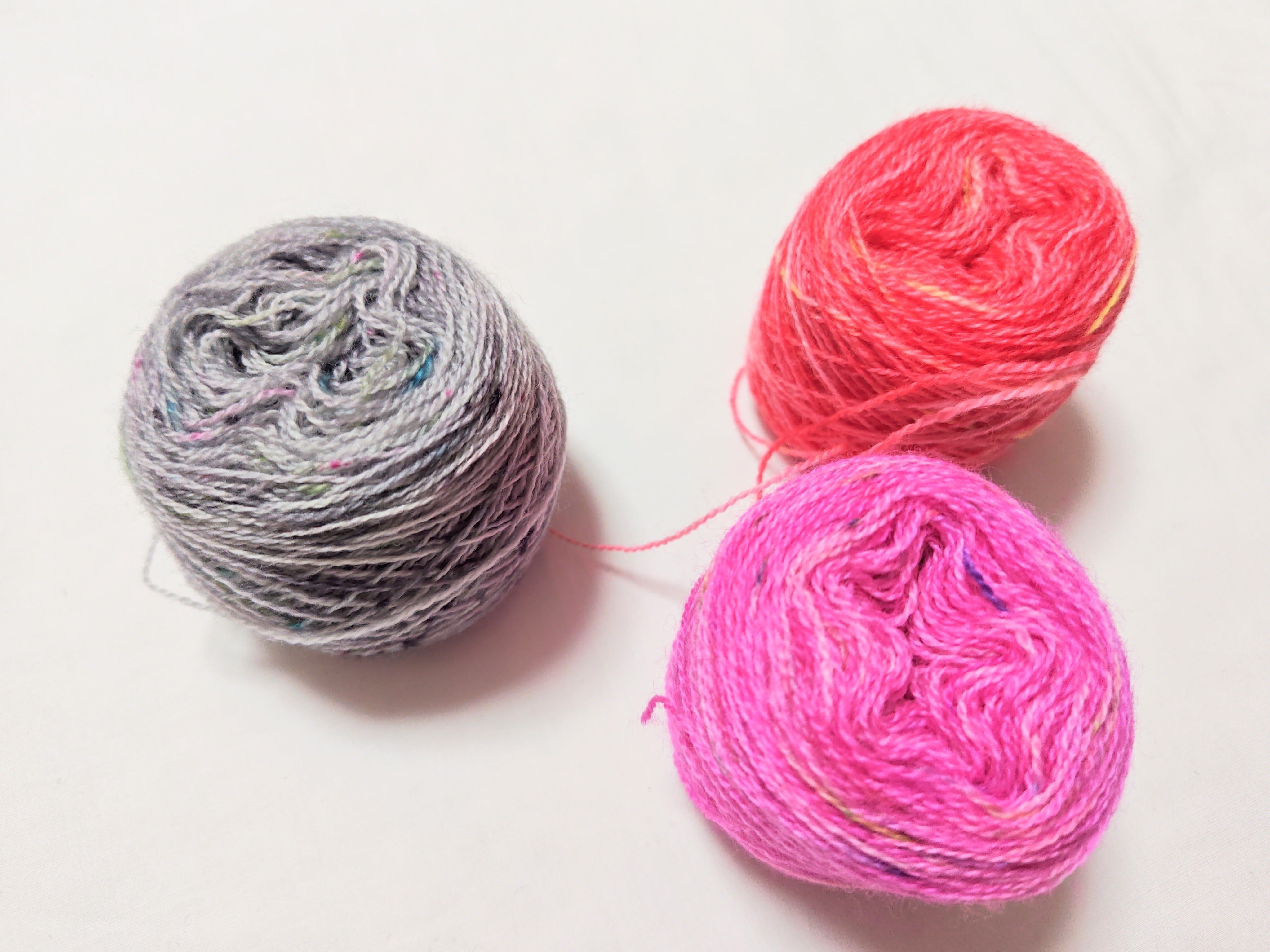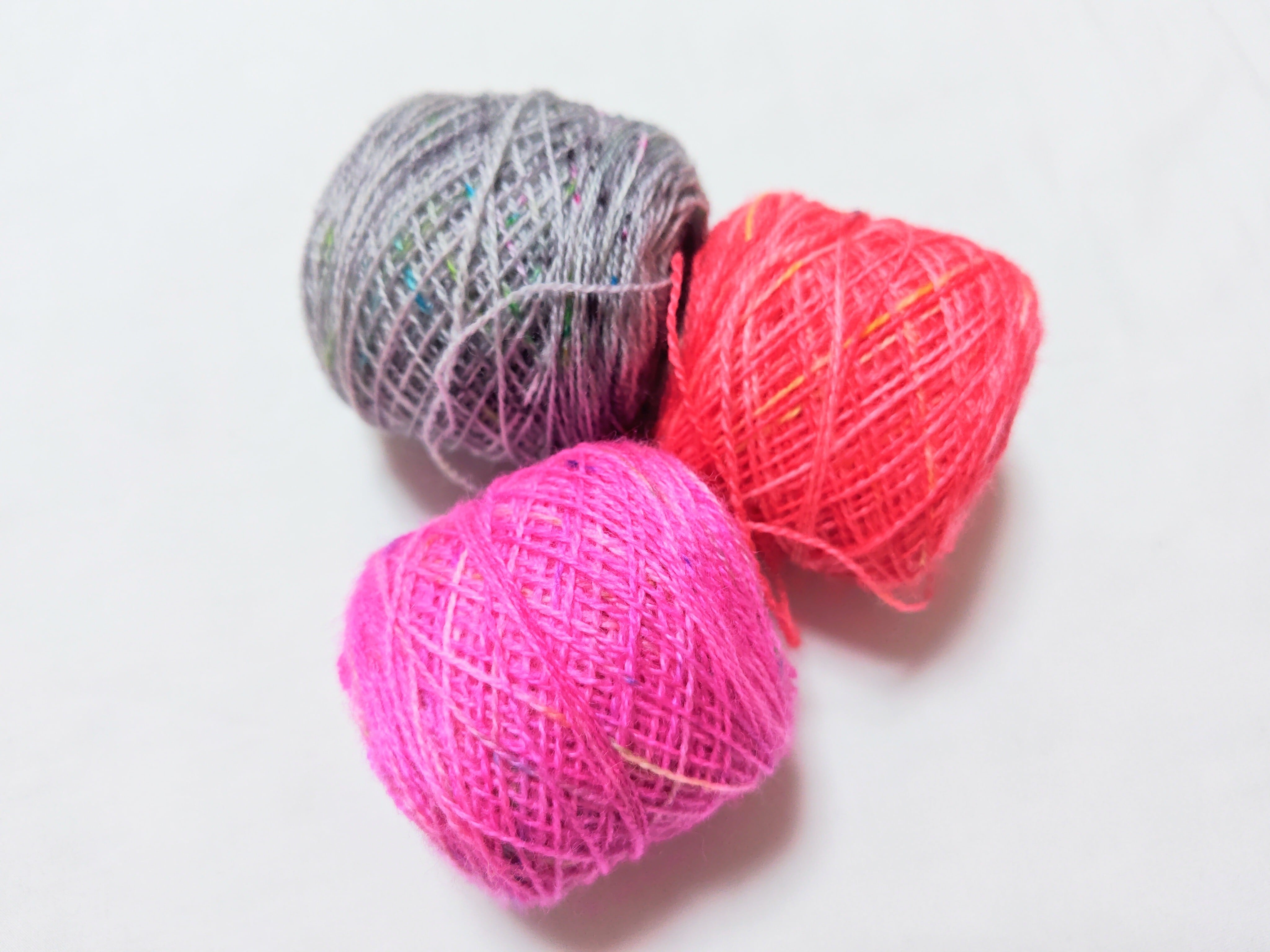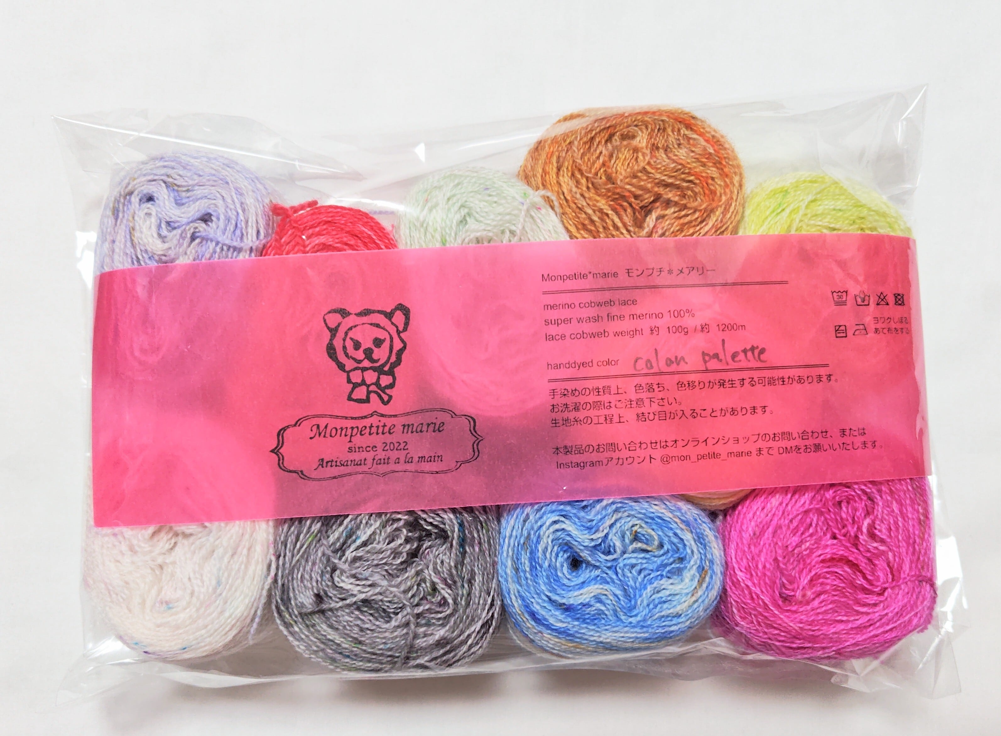 cobwebは蜘蛛の糸の事。細いけれどしっかりしたメリノウール100% の糸をモンプチ流に手染めしました。小さい作品用に小分けにして、それでも沢山の色がある方が楽しいと思いますので、10色に染めました。約10gずつの小分けにして玉巻きしたものをぎゅっと詰めてのお渡しです。