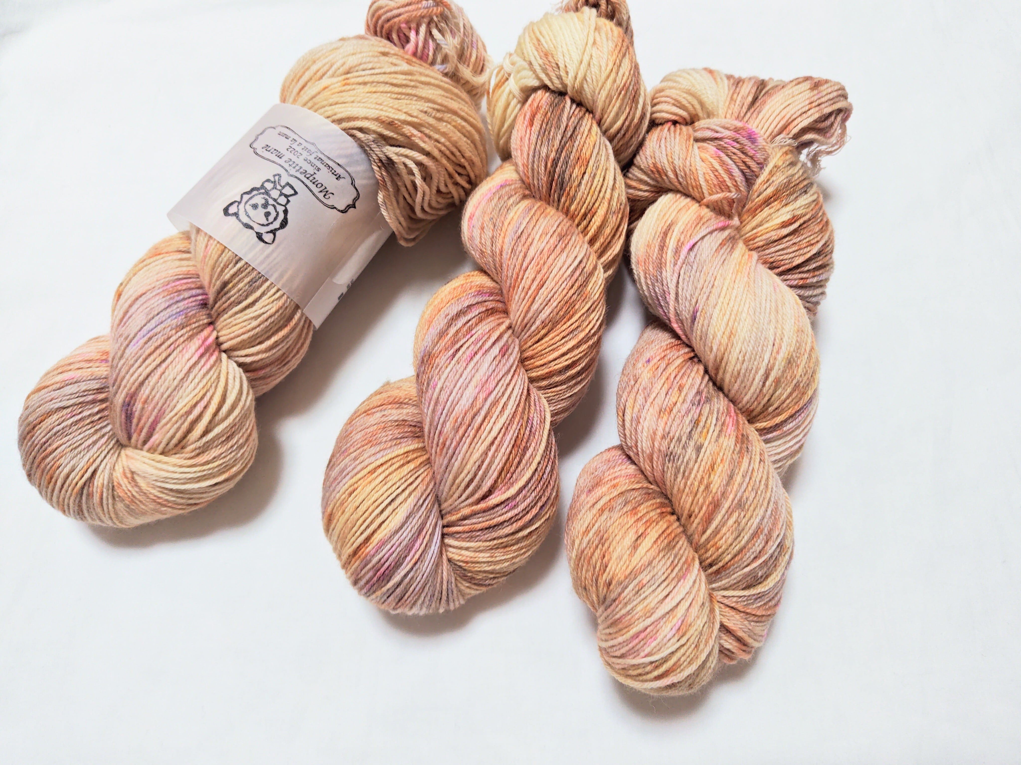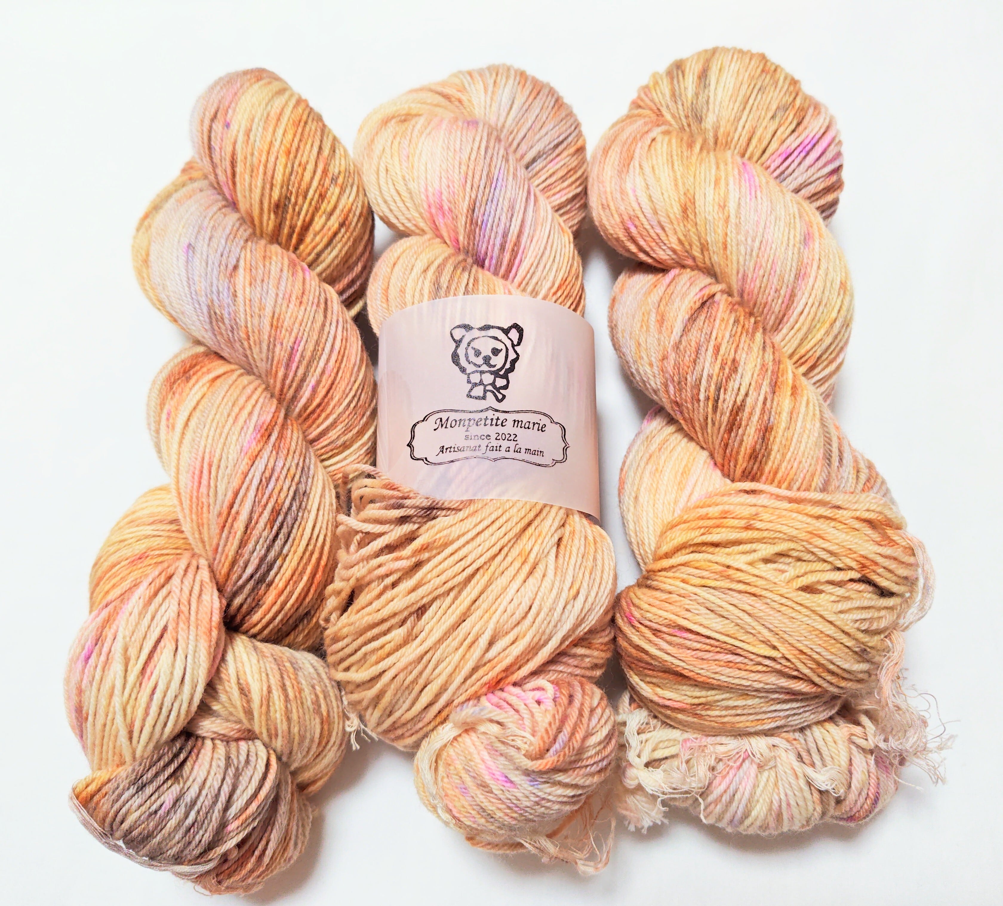 手染めの特徴で、全く同じものを染めることができません。柄や模様の出方は編む方の手加減や、使う針、編み方によって変わってきます。見本はあくまで参考です。できるだけ商品と同じ色に近づけて撮影していますが、お使いのモニターによって違う色合いに見えることがあります。