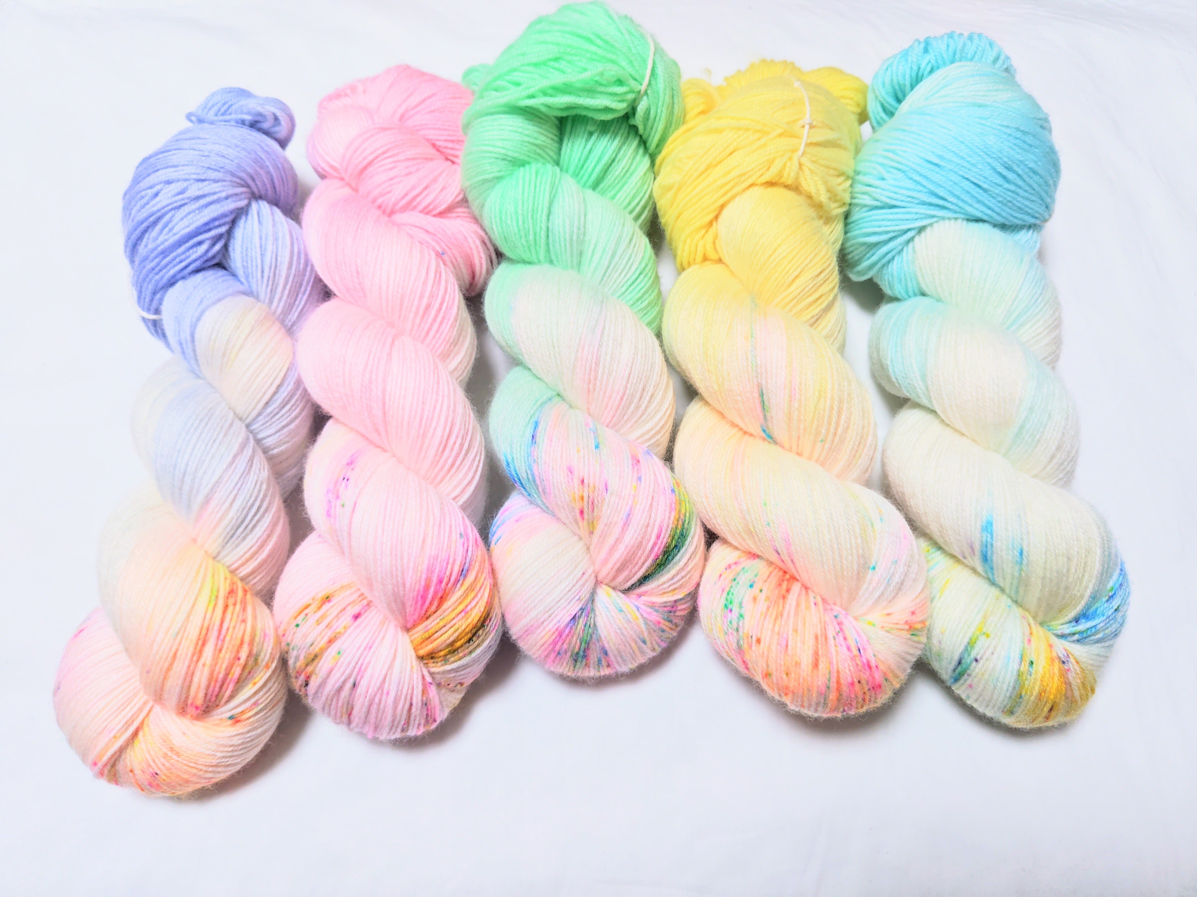 手染めの特徴で、全く同じものを染めることができません。柄や模様の出方は編む方の手加減や、使う針、編み方によって変わってきます。見本はあくまで参考です。できるだけ商品と同じ色に近づけて撮影していますが、お使いのモニターによって違う色合いに見えることがあります。