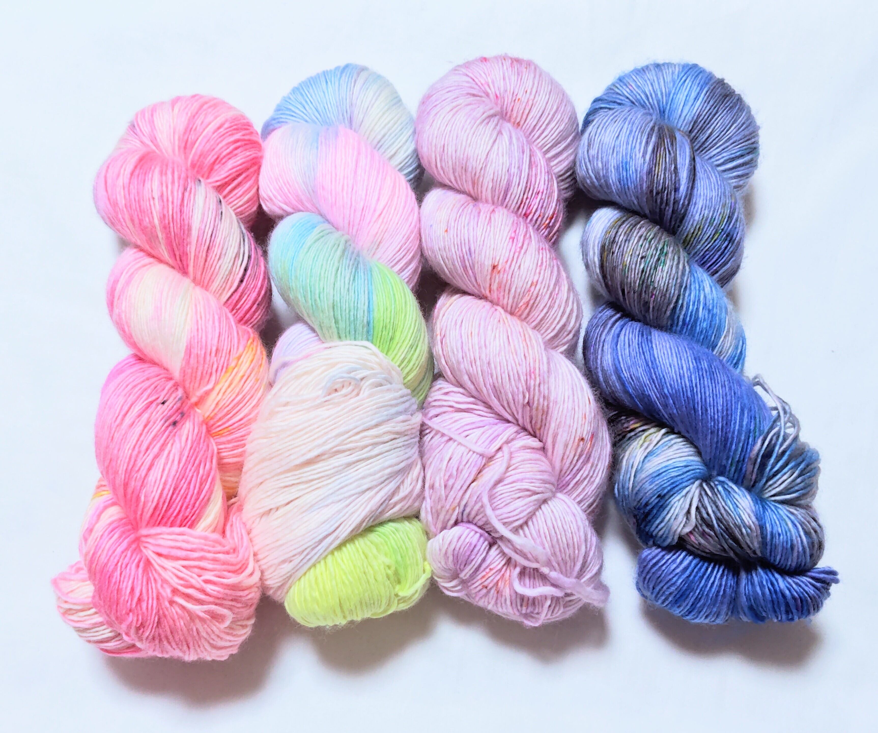 手染めの特徴で、全く同じものを染めることができません。柄や模様の出方は編む方の手加減や、使う針、編み方によって変わってきます。見本はあくまで参考です。できるだけ商品と同じ色に近づけて撮影していますが、お使いのモニターによって違う色合いに見えることがあります。