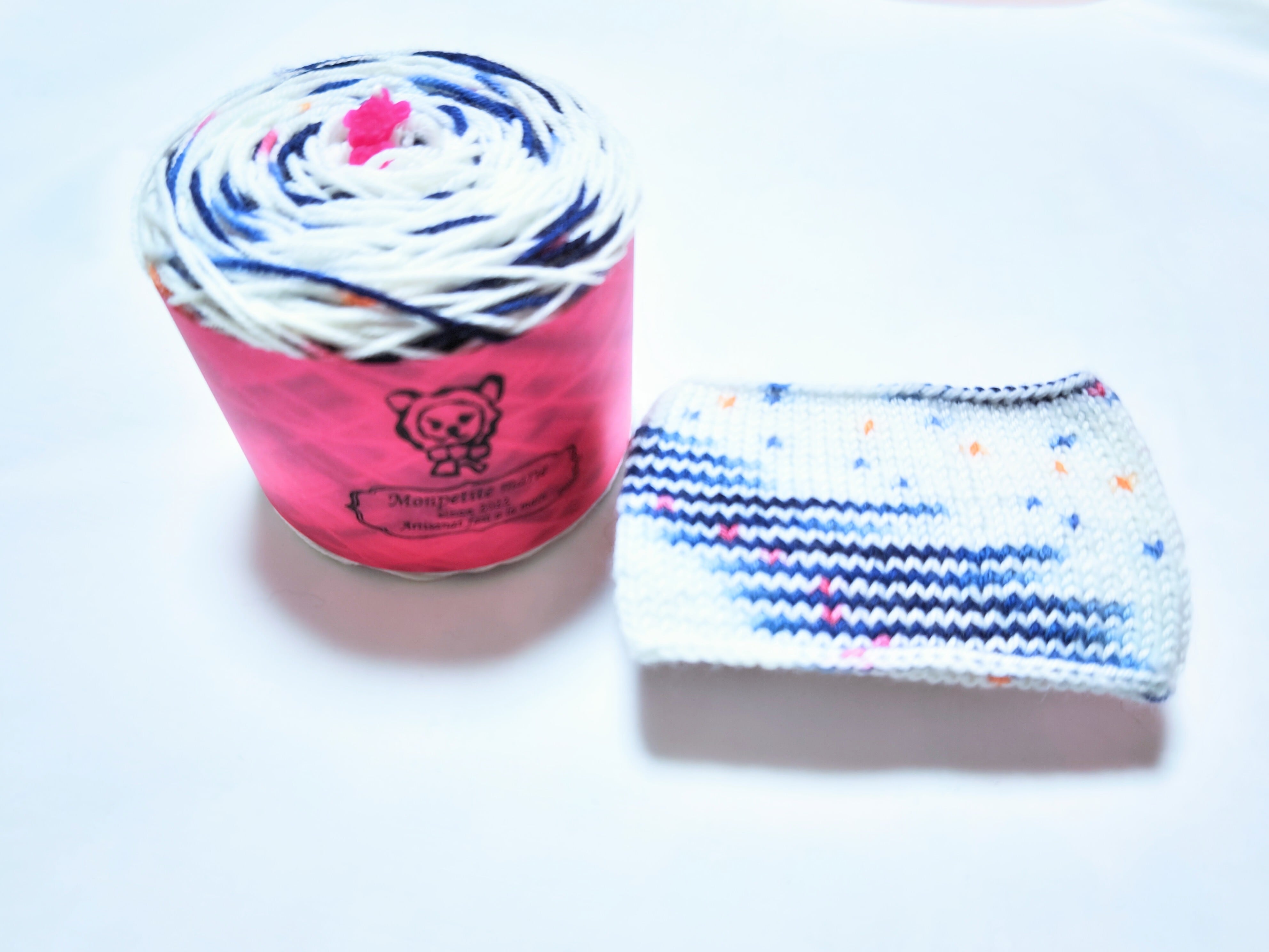 日本らしい紺色と、白地にピンクとオレンジのつぶつぶがとっても可愛らしい毛糸になります。まるで浴衣のがらのようです。