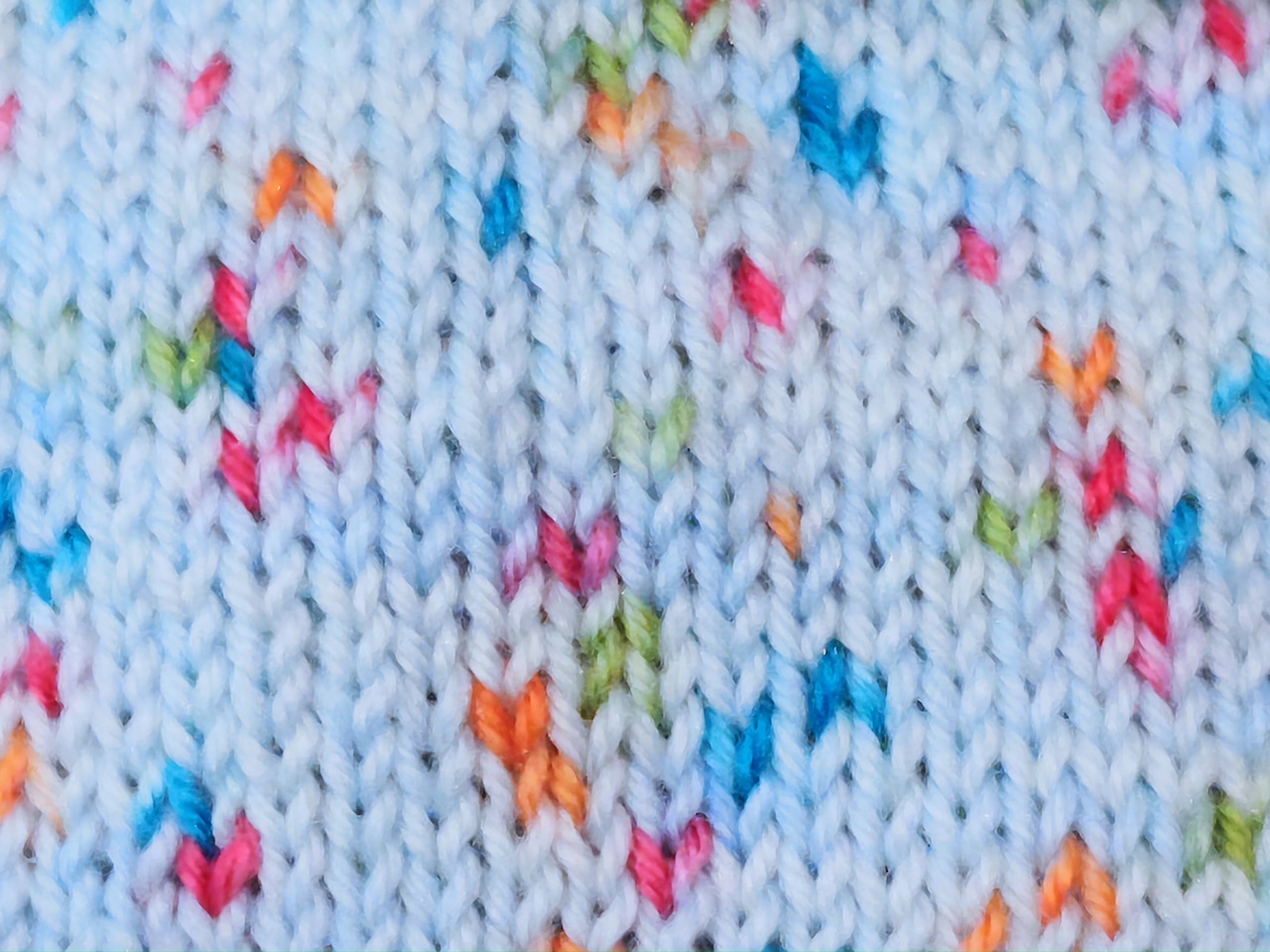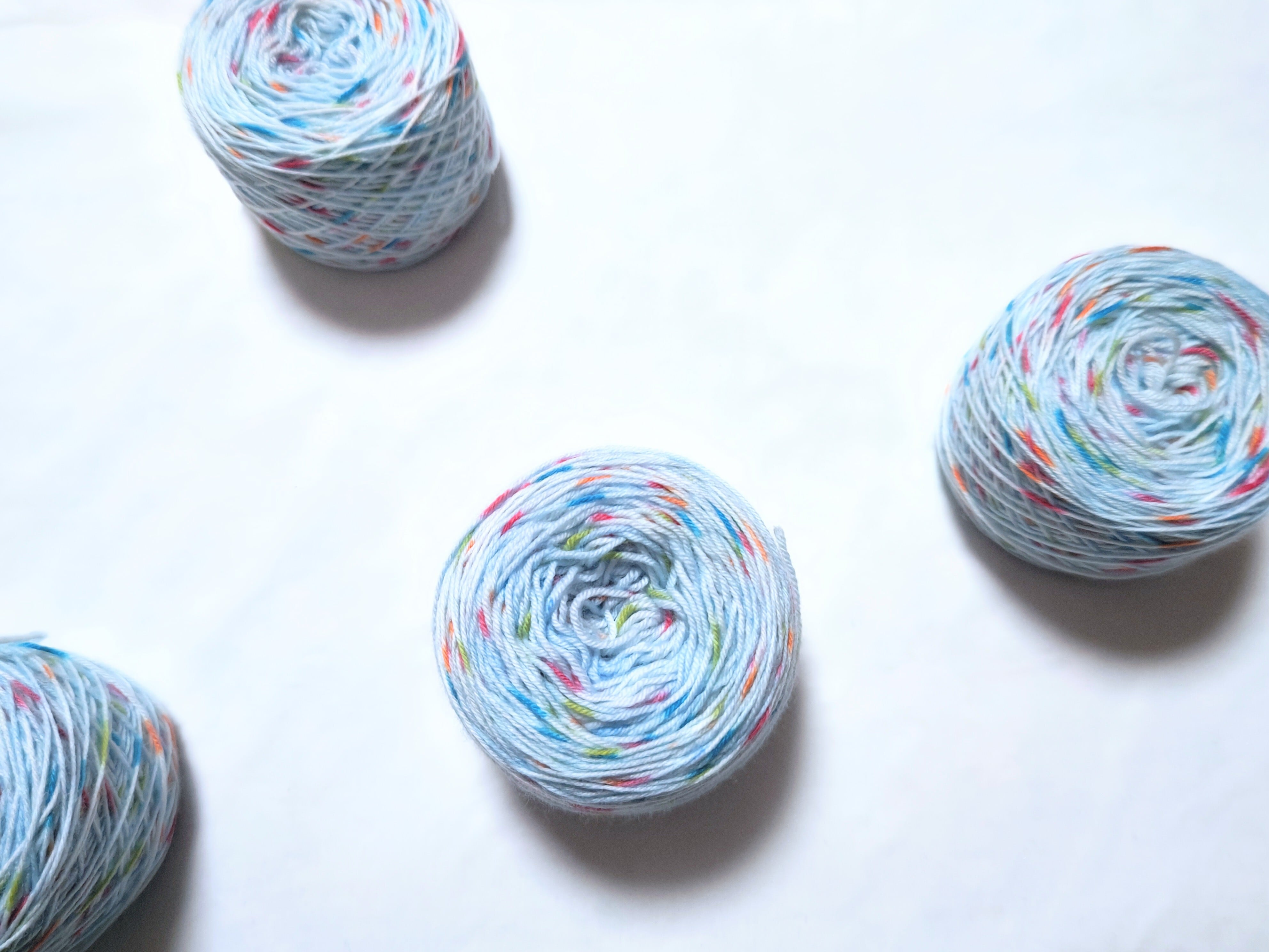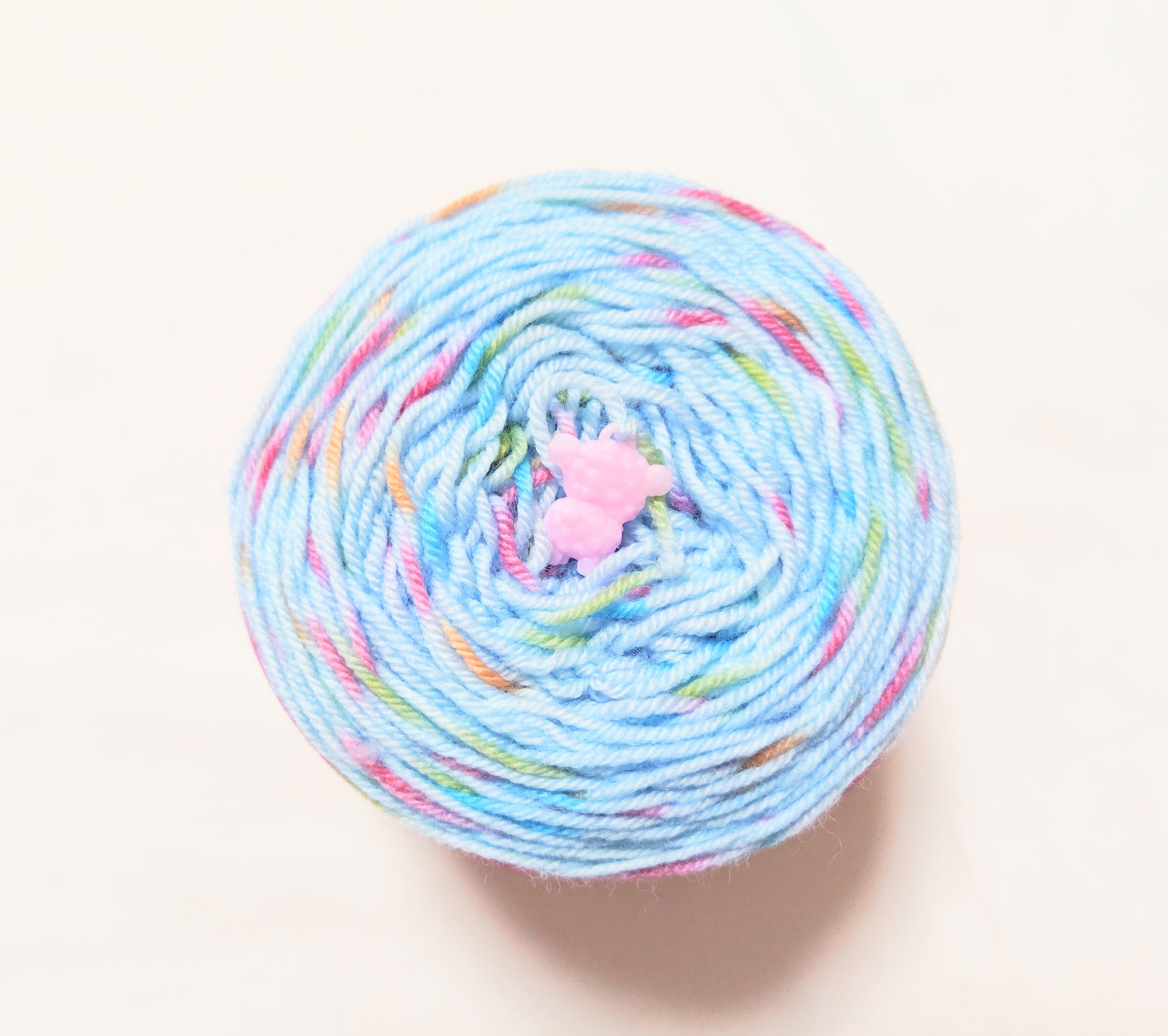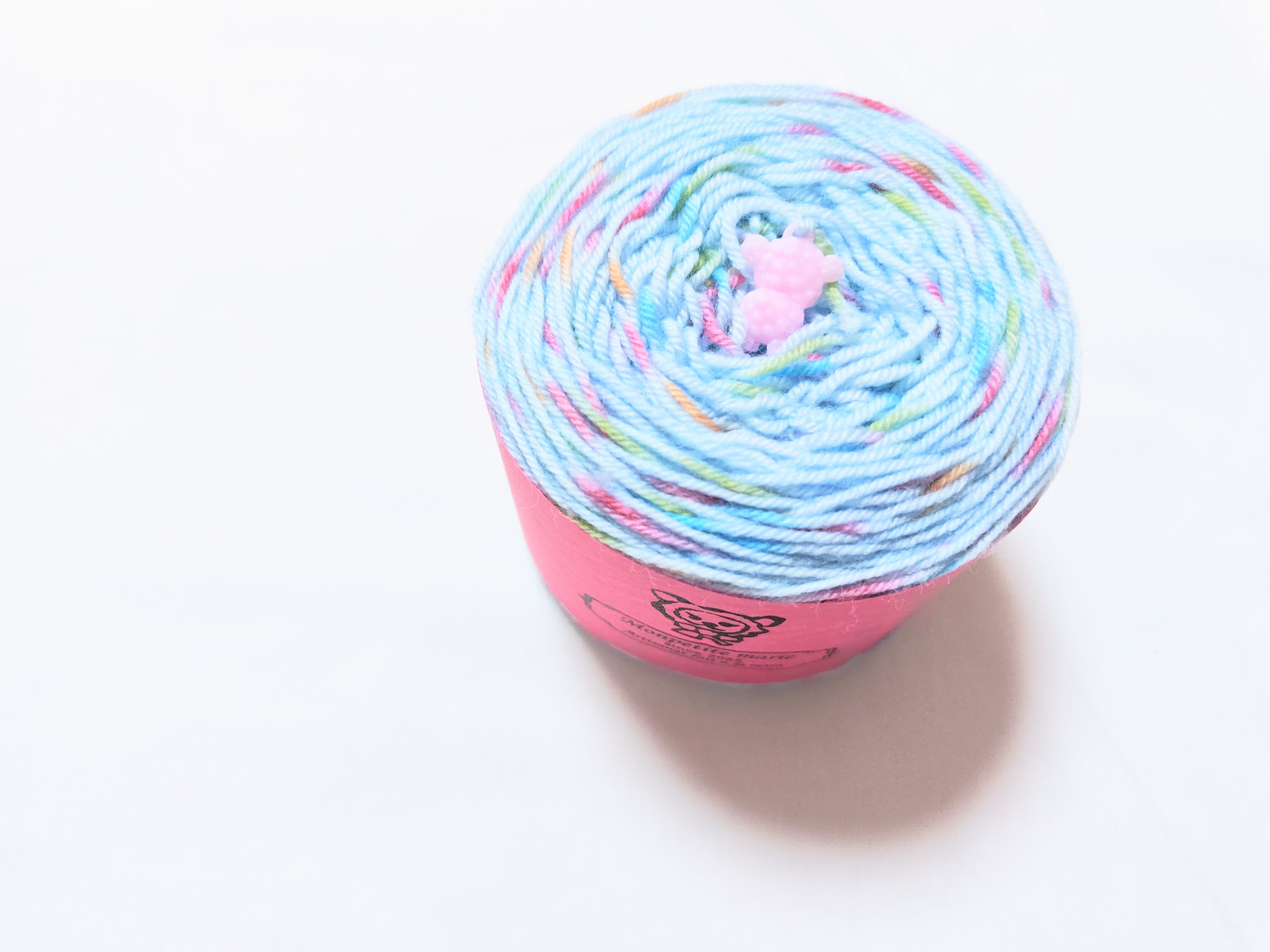『ドロップス・ソーダ』です。優しいパステルカラーの水色がそれだけでもとても可愛い糸ですが、あめ玉のように可愛くて彩りいっぱいの粒々が沢山ちりばめられています。見るとワクワク編むとウキウキ楽しくなる毛糸です。