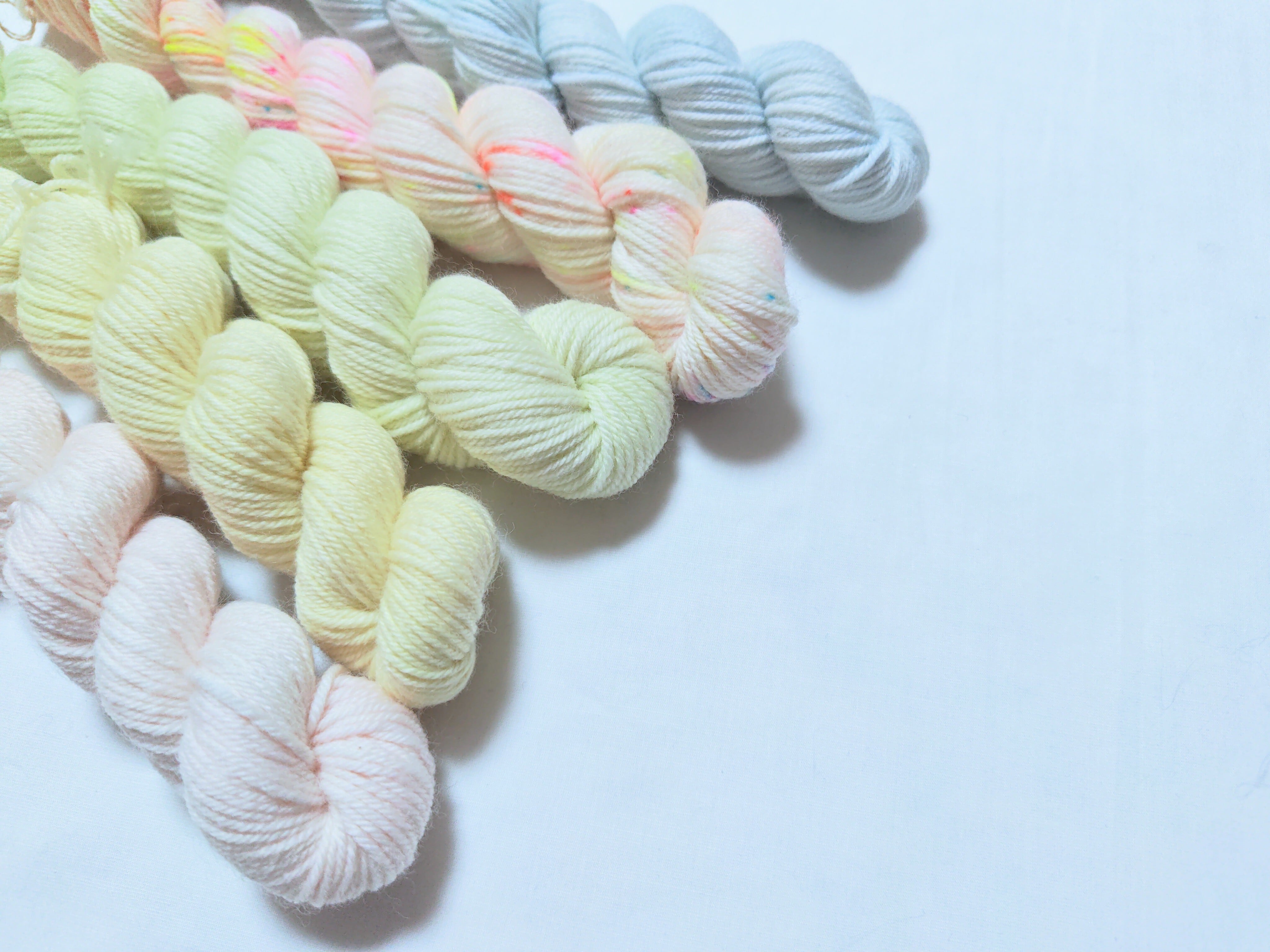 キャンディクラッシュのスペックルヤーンとマカロンカラーのセミソリッドを4色セットにしました。とても可愛いセットです。これだけでカラフルな作品を作れますが、他の糸と合わせても無限の可能性が広がる楽しいセットです。