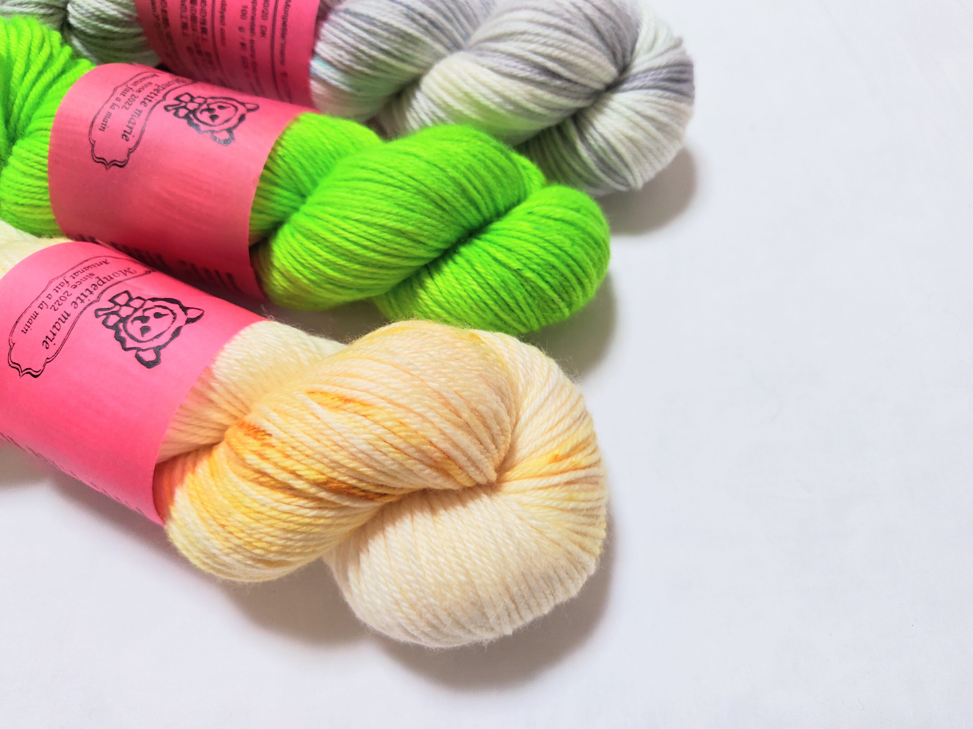 あっ!どんな人混みでもこの色は見つけやすい!明るい蛍光キミドリの手染め毛糸です。